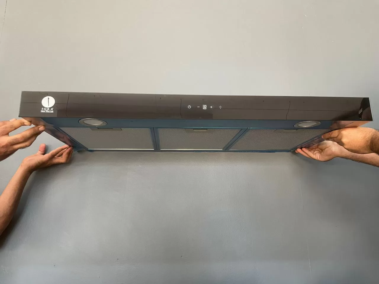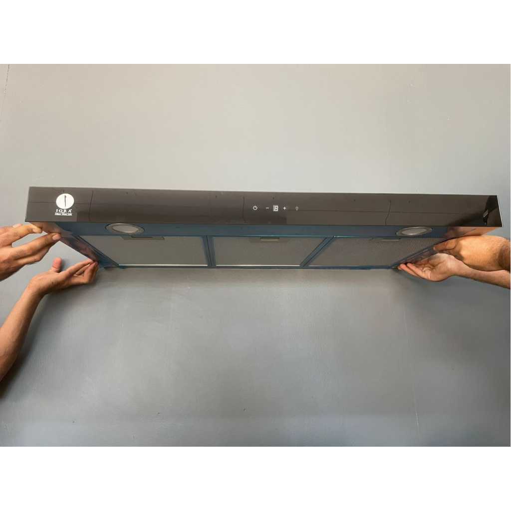 IQRA 90cm Ductless Under Cabinet Cooker Hood, Kitchen Extractor Fan, IQ-CM9012G – Black Design : Sleek built-under design with a width of 90 cm , perfect for modern kitchens. Color & Material : Crafted in durable stainless steel with a professional stainless steel finish. Control : Easy-to-use push-button controls for quick operation. Speed Settings : Features 3-speed power level options to match your cooking style and recipes. Performance : Efficient grease filtration system ensures a fresh ambiance in the kitchen. Lighting : Equipped with halogen lamps providing warm lighting to enhance your cooking experience. Installation : Designed for built-in installation, ensuring a seamless fit under kitchen cabinets. Energy Efficiency : Rated F for energy efficiency, balancing performance and energy usage. Dimensions : With a product depth of 482 mm , it fits comfortably in standard kitchen layouts. Additional : The hood operates at a sound power of 68 dB at maximum speed, ensuring a quieter kitchen environment.