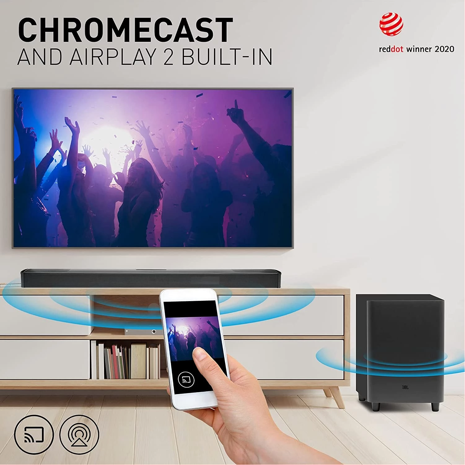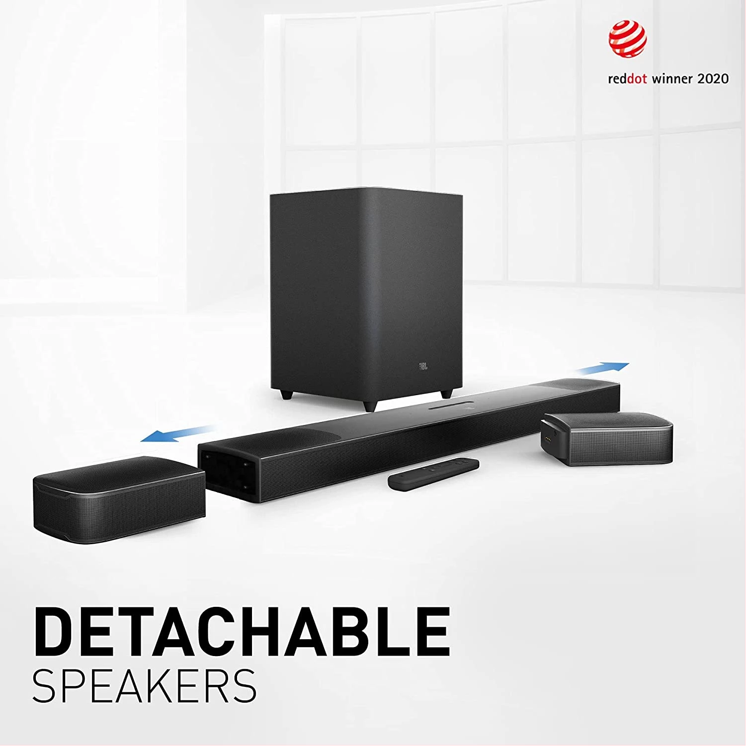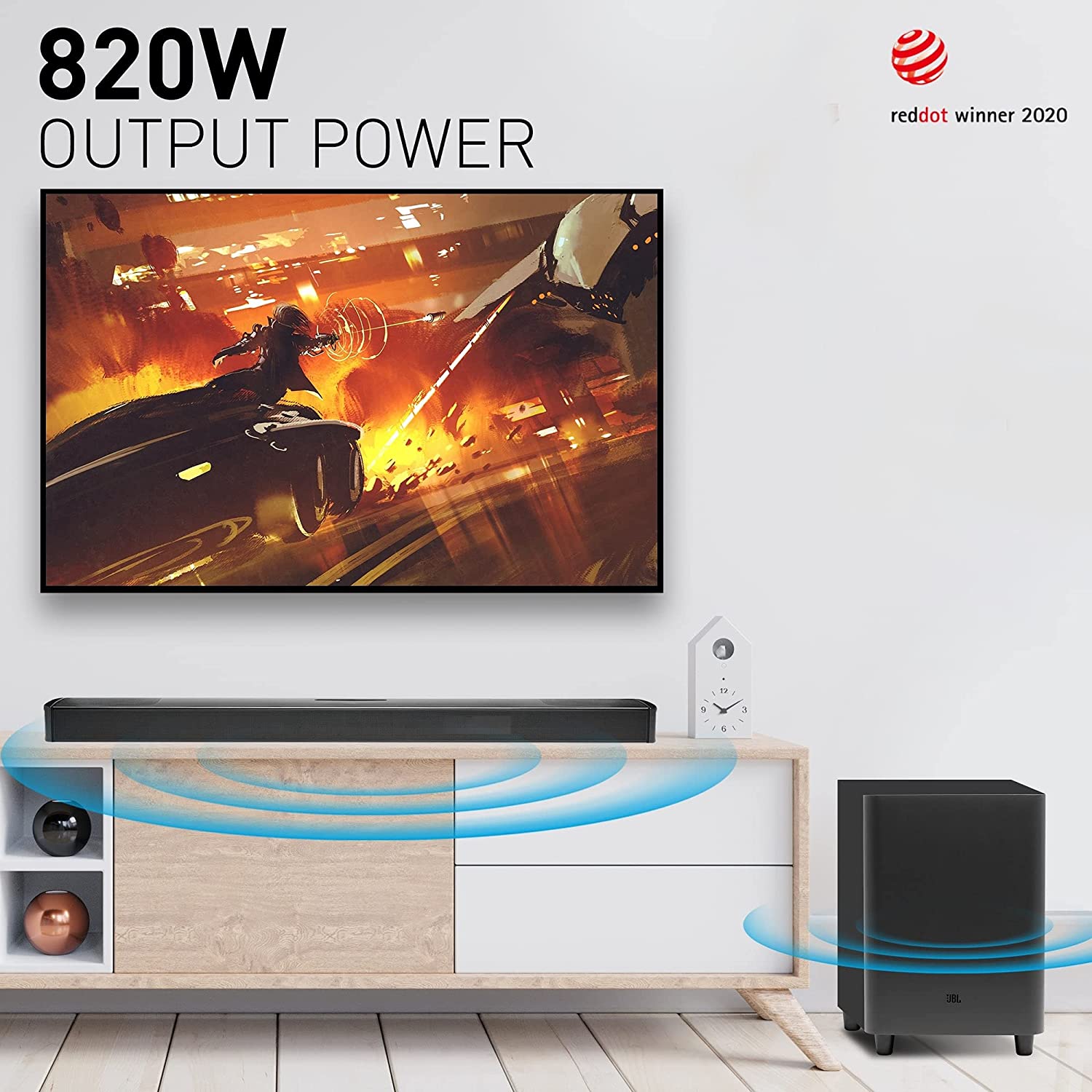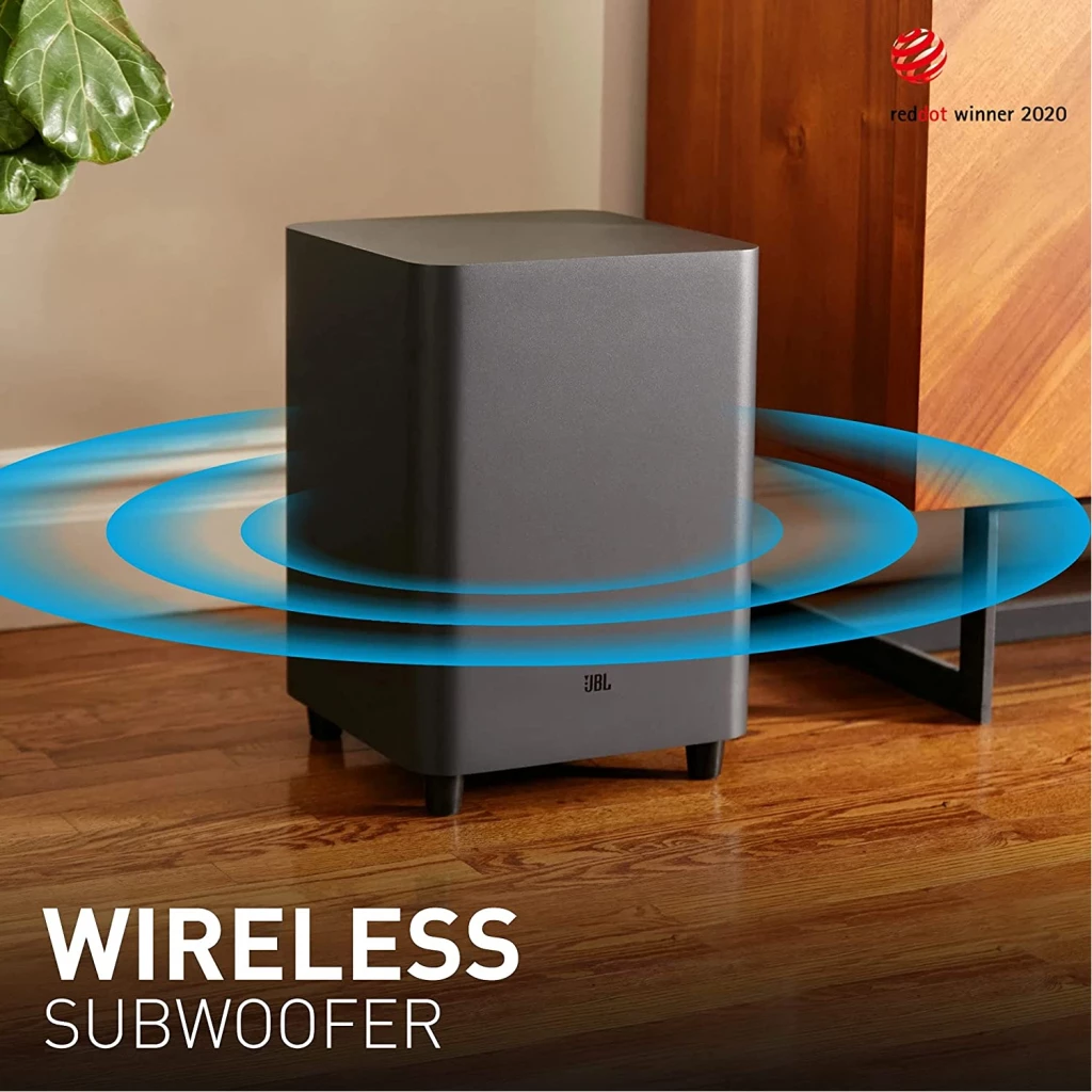 Key Features: JBL 9.1 Channel Soundbar, 820W 3D Sound Home Theatre System, 4K Ultra HD Dobly Vision With HDMI Port, Bluetooth & Built in Chromecast Sound Bar – Black 9.1 Channel, 820 Watt Output Powerful Soundbar System Built-in Dolby Atoms & DTS:X and 4 Upward firing speakers provide ultimate 3D Sound Experience Two True Wireless Detachable Speakers to place anywhere gives Cinematics 9.1 Surround Sound Experience 10 Inch Wireless Subwoofer with Punchy & Precise Bass Ultra HD 4K Pass-through with Dolby Vision Built-in Wi-Fi Compatibility with Chromecast and Airplay 2 for Online Streaming Seamless Wireless Streaming with Bluetooth What’s in the box: 1 x Main Soundbar, 2 x Detachable wireless surround speaker, 1 x Wireless subwoofer, Remote control with 2 x batteries, Power cords (up to 8pcs depending on region SKUs), HDMI cable x 1, 2 x L-Shape wall-mount bracket (for Surround speakers) kit with screws, Quick start guide, Warranty card, Sagfety sheet, Side caps (x 4, For some regions only) 1 year manufacturer’s warranty.