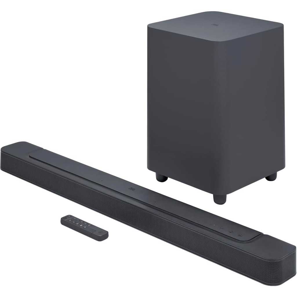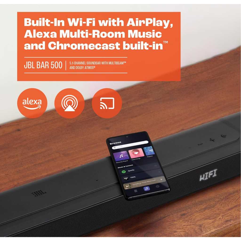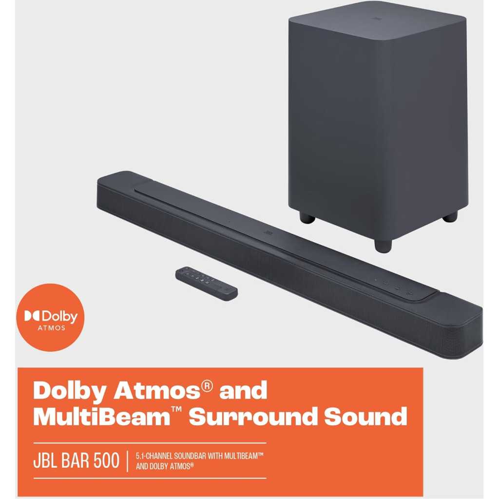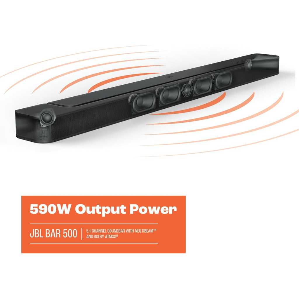 From the manufacturer Amazing 3D Sound with Thrilling Bass JBL BAR 500 The JBL Bar 500 brings your movies to life with MultiBeam and Dolby Atmos 3D surround sound. PureVoice technology optimizes voice clarity so you never miss a word. Feel the bass from the wireless 10″ subwoofer. And with AirPlay, Alexa Multi-Room Music (MRM) and Chromecast built-in, you’ve got 300+ streaming options.