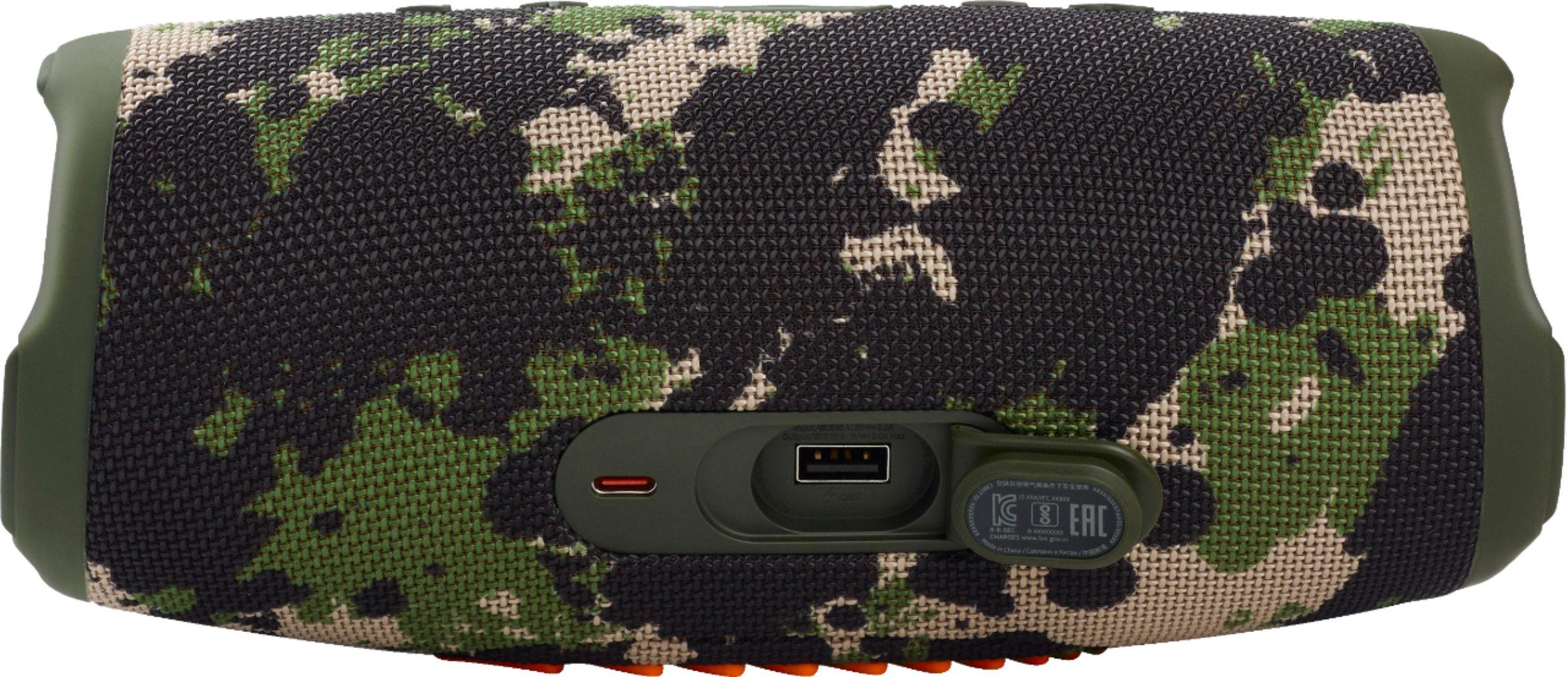 JBL Charge 5 Speaker, Portable IP67 Waterproof Wireless Bluetooth Speaker, JBL Pro Sound, 20 Hours Play Time, Built-in 7500mAh Power Bank- Camo Play and charge endlessly. Take the party with you no matter what the weather. The JBL Charge 5 speaker delivers bold JBL Original Pro Sound, with its optimized long excursion driver, separate tweeter and dual pumping JBL bass radiators. Up to 20 hours of playtime and a handy powerbank to keep your devices charged to keep the party going all night. Rain? Spilled drinks? Beach sand? The IP67 waterproof and dustproof Charge 5 survives whatever comes its way. Thanks to PartyBoost, you can connect multiple JBL PartyBoost-enabled speakers for a sound big enough for any crowd. With all-new colors inspired by the latest street fashion trends, it looks as great as it sounds. Bold JBL Original Pro Sound Take the amazing power of JBL Pro Sound with you. The JBL Charge 5 has an optimized long excursion driver, a separate tweeter, and dual JBL bass radiators, all delivering impressively rich and clear audio. Get that big room sound, even when outdoors.