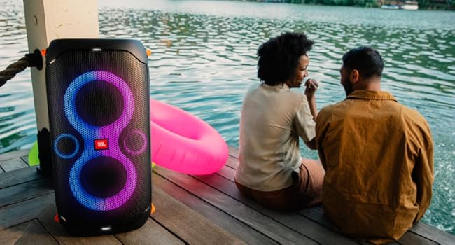 JBL PartyBox 110 – Portable Party Speaker With Built-in Lights, Powerful Sound, And Deep Bass – Black. JBL Partybox 110 Portable party speaker with dazzling lights JBL PartyBox 110 – Portable party speaker with built-in lights, powerful sound and deep bass, 160W power output, IPX4 splashproof, 12 hours of playtime, App, Bluetooth, JBL True Wireless Stereo for 2 party speakers pairing, speaker for home, outdoor, exercise and parties.
