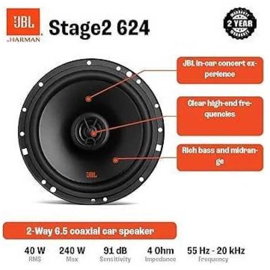 Key Features: 6-1/2″ (160mm) Three Way Car Speaker Power Handling: 40Wrms, 250W peak Nominal Impedance: 4ohms Audio Specifications Sensitivity (@ 2.83V): 91dB Frequency Response: 55Hz – 20kHz With the goal of providing access to great JBL sound at an affordable price, our engineers valued engineered the Stage2 Series speakers to deliver great sound at an affordable price. For most brands, off-the-shelf speakers and a cursory approval of frequency response curves are good enough. That’s not the case with JBL. We don’t only listen to our speakers against the competition -we voice them against each other to ensure each line has the consistent JBL sound signature that’s known and sought out by those who care about their audio. 6-1/2″ (160mm) Three Way Car Speaker Power Handling: 40Wrms, 250W peak Sensitivity (@ 2.83V): 91dB Frequency Response: 55Hz – 20kHz Nominal Impedance: 4 ohms