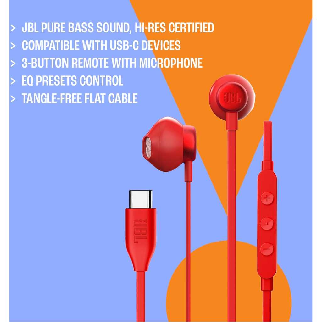 Key Features: Pure Bass Sound: Hi-Res audio provides punchy bass and terrific treble, delivering clear and detailed sound quality with a wide frequency range between 20-40 kHz Versatile Compatibility: The USB-C connection lets you enjoy seamless streaming through your PC, mobile or gaming device; answer calls or chat with your teammates thanks to the built-in microphone Tailored to Your Needs: Switch between Default, Bass or Vocal EQ presets to find the optimal sound that suits your style, with the intuitive and innovative 3-button remote on the wire Stress-Free Listening: Those days of knotted-up headphones in your bag or coat pocket are over thanks to the flat cable design that prevents tangles, for easy listening at work, at home or on the road Items Delivered: 1 x JBL Tune 305 C USB-C headphones, 1 x 3 different sizes of ear tips, 1 x warranty/warning/safety sheet, in blue