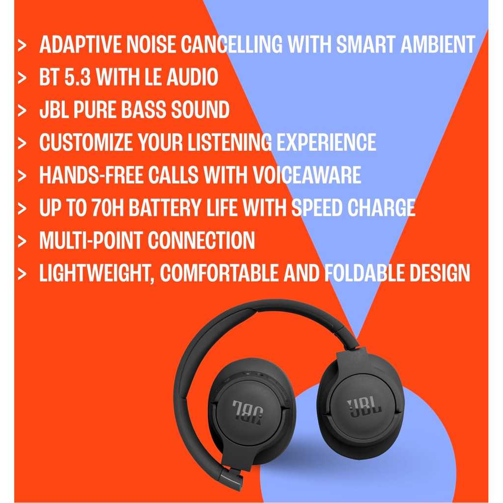 Key Features: Adaptive Noise Cancelling with Smart Ambient: Adaptive Noise Cancelling means zero distractions whether you’re studying or getting lost in the music. If you want to hear the world around you, activate Ambient Aware and TalkThru in the JBL Headphones app. Bluetooth 5.3 with LE Audio: Wirelessly stream high-quality JBL Pure Bass Sound. In the JBL Headphones app select Audio mode for the best sound quality or Video Mode to ensure the sound and visuals of your movie/game are in sync. *Available via OTA update JBL Pure Bass Sound: JBL Tune 770NC headphones feature renowned JBL Pure Bass sound—the same that powers the most famous music venues all around the world. Customize your listening experience: Download the free JBL Headphones App to tailor the sound to your taste by choosing one of the pre-set EQ modes or adjusting the EQ curve according to your content, your style, your taste. Hands-free calls with VoiceAware: Easily control your sound and manage your calls from your headphones with the convenient buttons on the ear-cup. Hear your voice while you’re talking, with the help of VoiceAware.