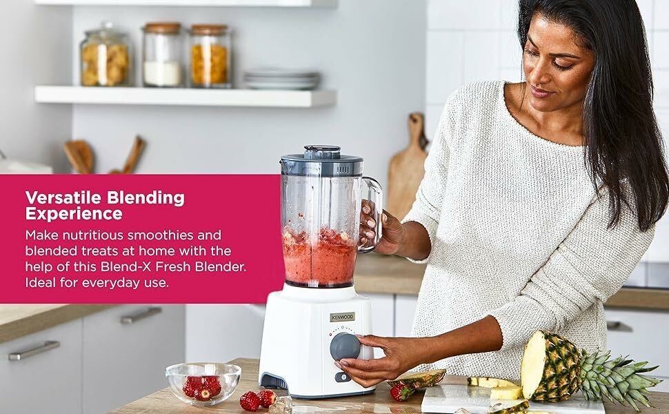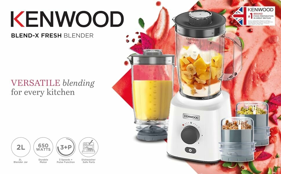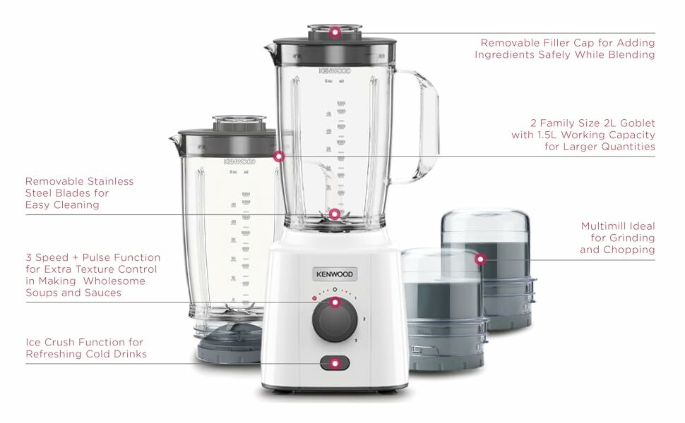Kenwood Blender 650W Smoothie Blender/Smoothie Maker Blend-X Fresh 1.5L With Extra Blender Jar, Grinder Mill, Grater Mill, Ice Crush Function BLP41.C0Wh White 650W powerful motor, 2L goblets ( 1.5L working capacity)for effective chopping and grinding for large quantities. 3speed + pulse function for extra texture control for wholesome soup and smooth sauces Ice crushing function for refreshing cold drinks Removable stainless steel blades for easy cleaning, removable filter cap simply and safely to add ingredients while blending