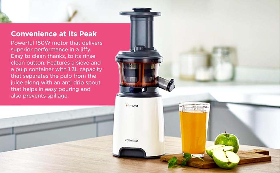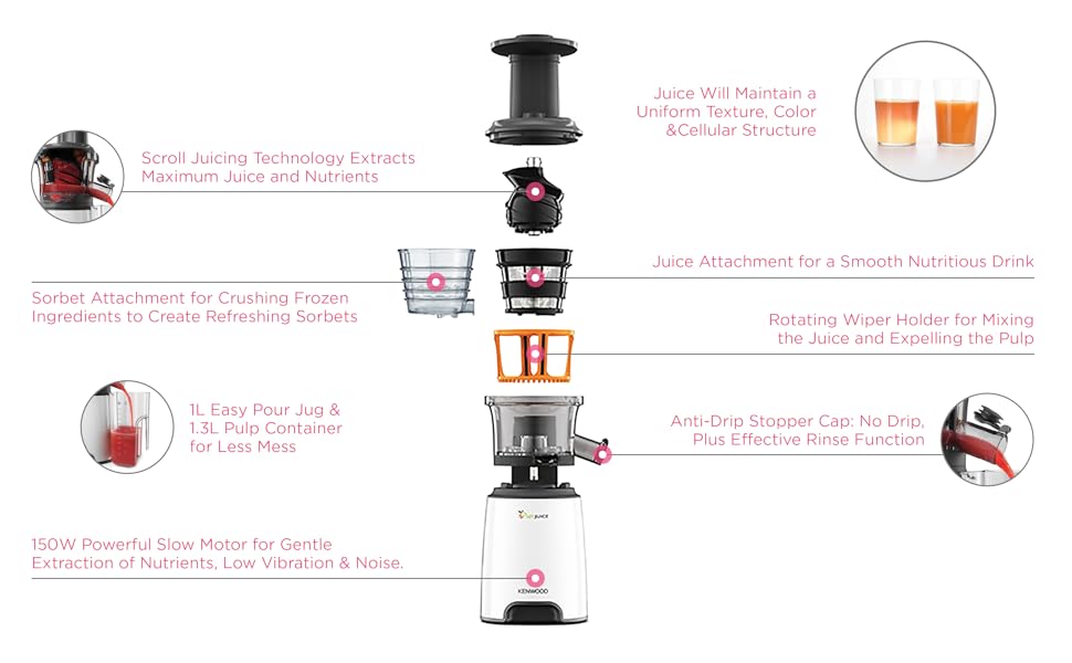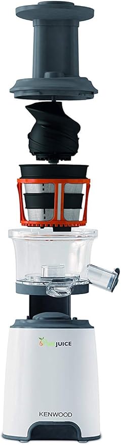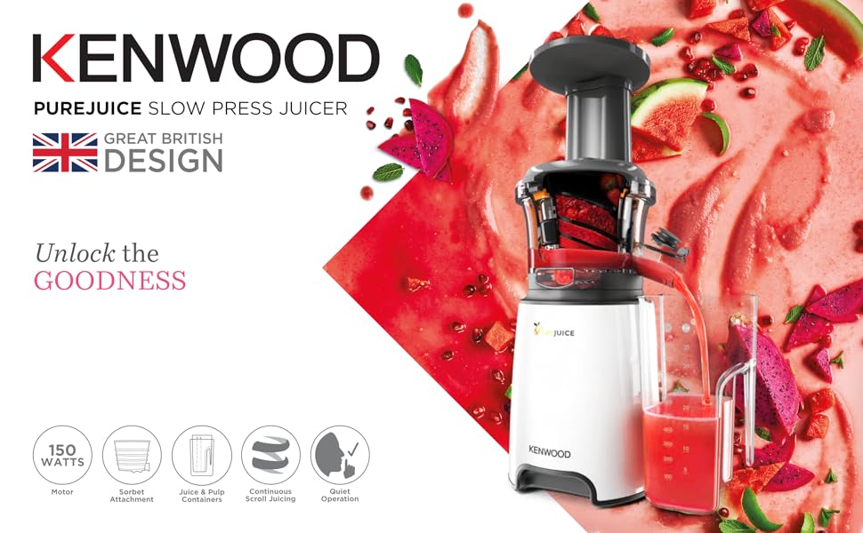 PureJuice JMP601WH is Kenwood’s new Slow Press Juicer. An effortless way to engage in a healthier lifestyle through consuming 100% natural juice. By slowly crushing ingredients Pure Juice can extract up to 80% juice and retains maximum taste, colour and nutrition. The JMP601WH comes complete with sorbet attachment allowing you to do more than just juice, you can also make healthy fresh sorbets. New Slow Press Juicer for a smooth nutritious drink. Quiet Operation Sssssh! Pulp Container for collecting fibre (1.3 Litre Air Capacity) Rinse clean function fill with water for effortless cleaning. Juice Jug 700 ml of fresh juice 1 Litre Air Capacity. No Drips anti – drip stopper for no spillages or drips. Extra Sieve for the option of juice with bits or silky smooth. Cleaning Brush. Sorbet Attachment Crushes frozen ingredients to create refreshing sorbets. 150 Watts motor. From the manufacturer