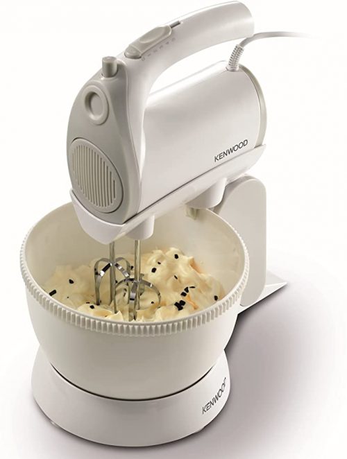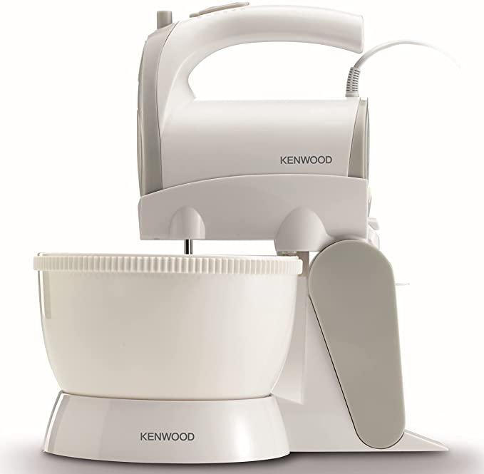 Kenwood Stand Mixer Hand Mixer (Electric Whisk) 300W with 2.4L Rotary Bowl, 5 Speeds + Turbo Button, Twin Stainless Steel Kneader and Beater for Mixing, Whipping, Whisking, Kneading HMP22.000WH White Use the hand mixer separately for quick convenient mixing or attach to the specially designed stand with rotating bowl for larger batches. Double removable hooks: Mixing hooks Whisking hooks