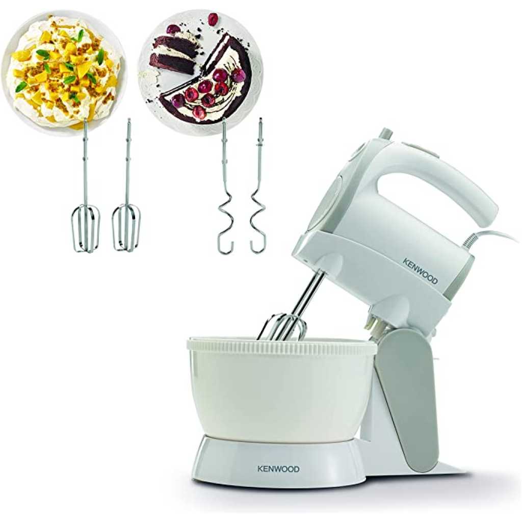 Key Features: Kenwood Stand Mixer Hand Mixer (Electric Whisk) 300W with 2.4L Rotary Bowl, 5 Speeds + Turbo Button, Twin Stainless Steel Kneader and Beater for Mixing, Whipping, Whisking, Kneading HMP22.000WH White 300 Watts Motor With Enhanced Cooling System For Fast Efficient Mixing. 2.4L Rotary Bowl With Automatic Bowl Rotation For Easy And Efficient Mixing. 5 Speed + Turbo For Folding, Mixing And Whisking & Eject Function Stand + Bowl For Dual Functionality Non-Degradable Stainless Steel Beaters For Added Durability And Strength , Kneaders For Your Doughs.