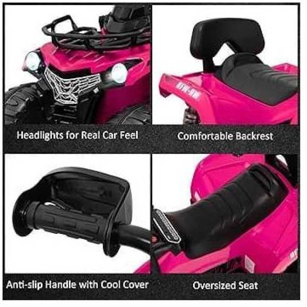 Description: Cheer your kids up with our four-wheeler ATV. This kids’ ride on ATV has quite an impressive outlook close to the real version to meet kids’ imagination. The headlights presents a more realistic atmosphere while the media functions of story, education and music allow kids to enjoy more. The built in USB socket and the MP3 interface with cable enable you to download your kid’s favorite songs and stories for your kids. This ride on car offers your kids high speed, and low speed driving with the ability to drive in reverse. and it is suitable for ride on most of the ground thanks to the oversized & shock absorbing wheels. The large 12V 7Ah battery supports lasting and continuous enjoyment. Features: Realistic design with vivid details meets every little racer’s dream A solid choice in kid’s holiday gift list for the 3 to 8 years old Equipped with headlights to fascinate your kids Oversized wheels conquer most of the road, be it sidewalks, wooden & tar roads and more The media function includes music, education, story,built in USB, MP3 sockets Your kid can adjust volume, switch from previous to next Kids can enjoy realistic driving forward and backward and experience slow and fast speeds Please remove the high speed protective cover before let your kids push shifter into the “high speed” position This ride on car is accelerated by the foot pedal 12V 7Ah rechargeable battery for lasting fun and enjoyment Specification: Color: Red, Black, Blue, Pink Material: Steel, PP Product Dimension: 39” x 24” x 29”(L x W x H) Maximum Capacity: 66 lbs Adaptable Age: 3-8 Years Battery: 12V 7Ah Net Weight: 35.4 lbs Speed: 1.9-3.7 mph Play Time: 40 Minutes Package Includes: 1 x Kids’ Ride On ATV 1 x MP3 Cable 1 x Charger Coolest Kids’ Ride On Car Toy: Certified by ASTM and CPSIA, our electric kids ATV meets the highest safety standards. Our toddler 4 wheeler features a realistic outlook mimicking the real beach ATV with fantastic details. The dashing LED headlights meets the imagination and build up the adventure of kids’ fantasies. Beyond this, the storage basket in the front of the car can hold your cute toys like shovels, books, etc. Early Driving Impression & Fun: Your kids can practice their control of directions through foot pedal, as well as take a funny reverse. They can as well enjoy driving thrills at varying speeds from lower 1.9 to fast 3.7 mph,which is totally in a safe range. Please remove the protective cover before starting the high speed gear. Entertaining Interactions: Our ride on ATV allows kids to tune in to music, story, and education. They can also adjust the volumes and switch from the previous and the next songs. With USB and MP3 sockets, it is possible to jam on your kids’ selection of songs and nursery rhymes. A MP3 cable is included in the package. Travels Everywhere & Long-time Fun: Featuring 4 wide wheels, this power wheels atvs is an ideal ride for flat ground, rubber track, cement road and more. The rear wheels are equipped with spring suspensions to greatly reduce the shock during traveling and enable the kids to cruise stably. Featuring a lasting 12V 7 Ah battery, the single charge will take for 8 to 10 hours and can provide 40 minutes of continuous fun (depending on the type of use) Ideal Toy to Accompany Your Children—Costzon Ride on ATV build your child’s sense of imagination and adventure. Send it to your boys or girls as a Christmas birthday gift. Let it accompany your kids and create cherished childhood memory. Recommended for children 3-8 years old, and the maximum capacity is 66 lbs.