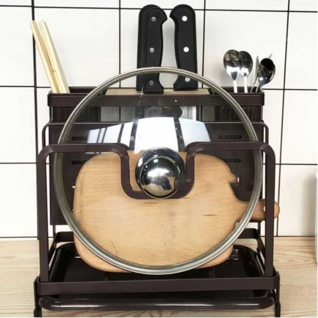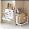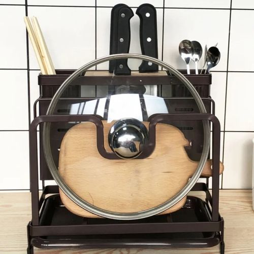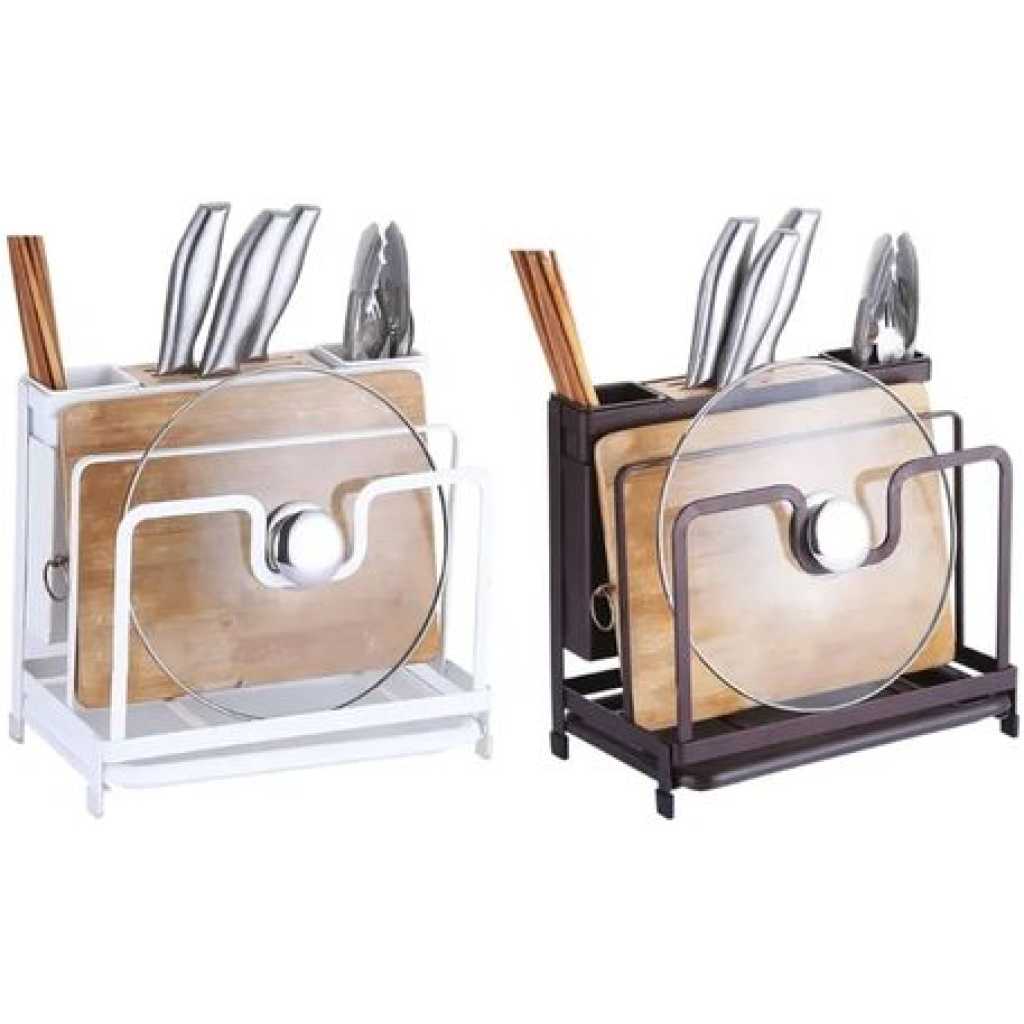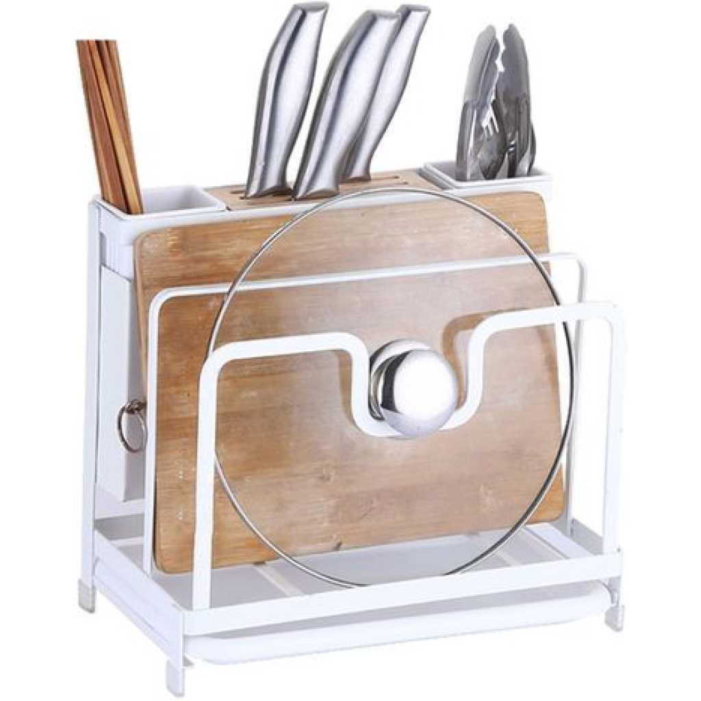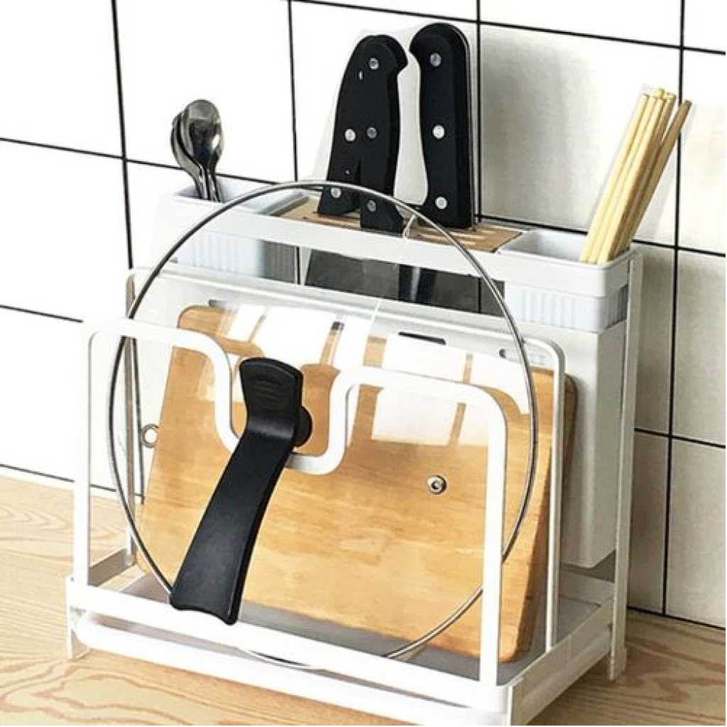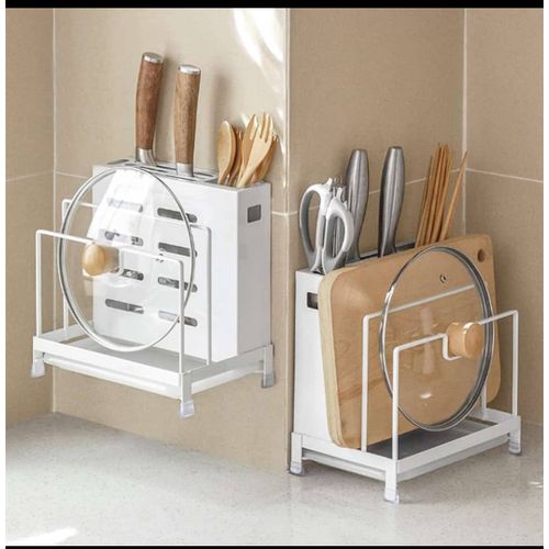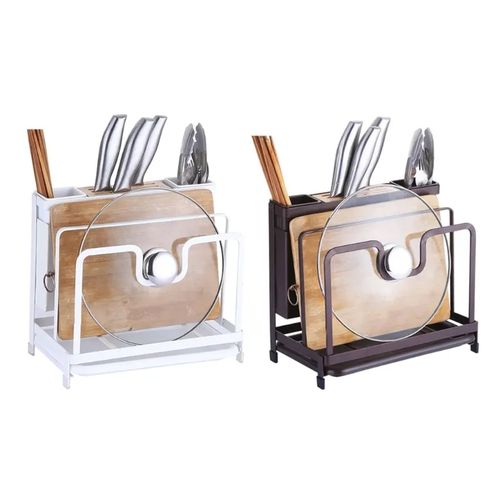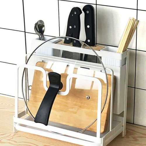 Key Features: Kitchen Utensils Tool Holder Block Storage Rack Cutting Board Stand Bakeware Pan Pot Cover Lid Cutlery Organizer- White. Provide versatile storage in compact spaces to keep supplies and essentials neatly stored in your kitchen office garage Painted stainless knife holder, thoughtful design, easy to solve the messy troubles in the kitchen. Double-layer protection, aesthetic and texture coexist, small footprint, for better storage, more space. Double chopsticks can hold multiple tableware, ventilation, easy to clean, safe and healthy. The bracket is tightly fitted, stable and not easy to slide, and can be placed on various cutting boards.