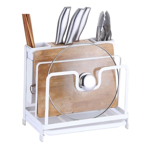 Kitchen Utensils Tool Holder Block Storage Rack Cutting Board Stand Bakeware Pan Pot Cover Lid Cutlery Organizer- White. Kitchen Utensils Tool Holder Block Storage Rack Cutting Board Stand Bakeware Pan Pot Cover Lid Cutlery Organizer- White. Multi-purpose design, perfect for holding pot lid, chopsticks, cutlery, knife, chopping board, etc.. An essential tool for kitchen. Storage rack, easy to install. With a drawable draining board; Ventilated design. Specification: Item name: Storage rack Style: Modern Color: Black, white Material: Carbon steel Size: 16 x 25 x 23.5 cm Note: 1. Please allow slight deviation for the manual measurement data and make sure you do not mind before ordering. 2. The colors deviation might differ due to different monitor settings, please kindly understand. Package Including Package includes: 1 x Storage rack 1 x Set of installation accessories
