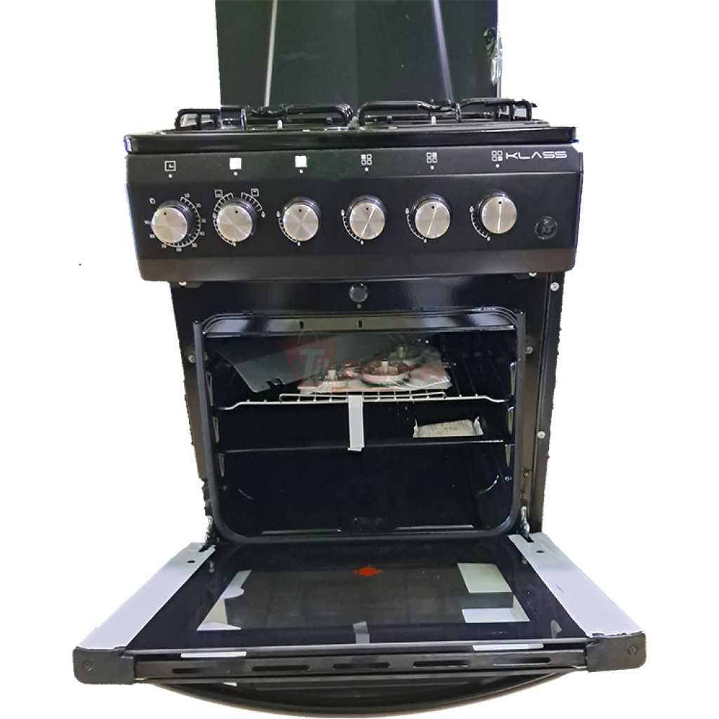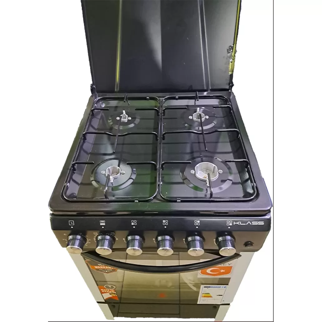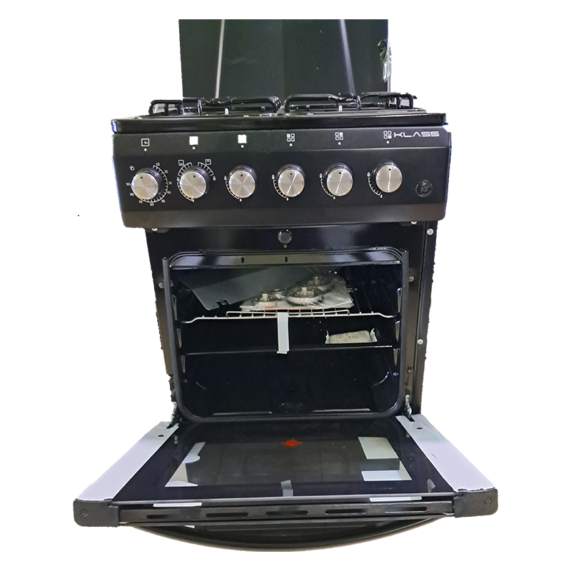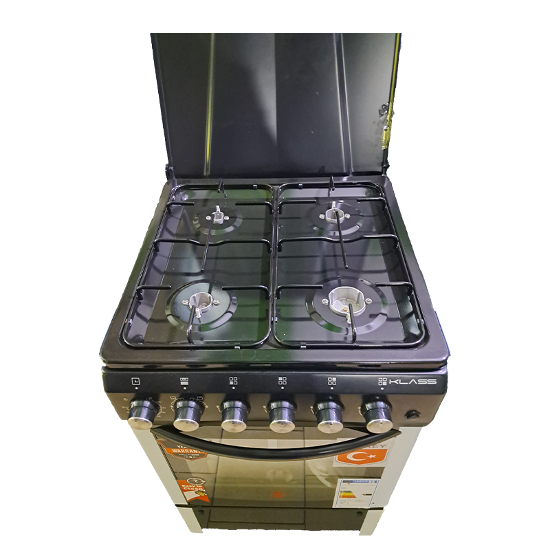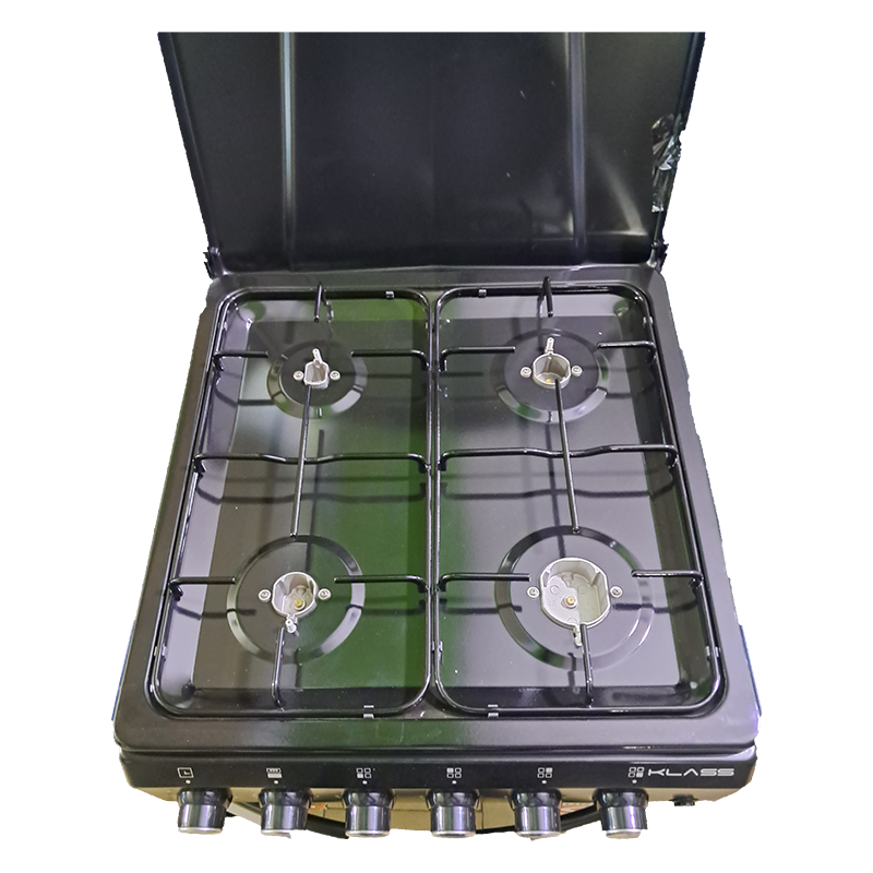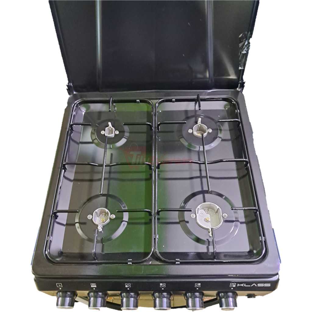 KLASS Free Standing Cooker 50x60cm, Full Gas, 4 Gas Burners, Gas Oven & Grill, Oven Lamp & Timer, 4TTE-5640BLK – Black. Klass Full Gas Cooker. 50x60cm Cooker. 4-Gas Burners. Gas Oven. Grill Oven Lamp Time Adjustable Stands. Strong Knobs Cast Iron Pan Supports 2 Years Manufacturer’s Warranty.