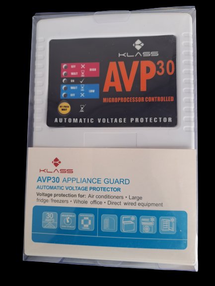 Key Features: KLASS KL-AVP30 30AH Air Conditioner Power Surge Protector – White. The AVS30 micro is a single phase Automatic Voltage Switcher rated at 30 Amps with a built in microprocessor . The AVS30 will switch off the equipment connected to it if the mains power goes outside pre set limits, and will reconnect automatically when the mains power returns to normal. Reconnection takes place after a time delay, to ensure mains stability. Protects Against: High voltage, low voltage, spike/surges, powerback surges and Loss Of Neutral (LoN) Ideal For: Air conditioners, Large fridge/freezers, whole office, complete circuit Max Power: 30A Wait Time: User adjustable from 10 seconds and 10 minutes
