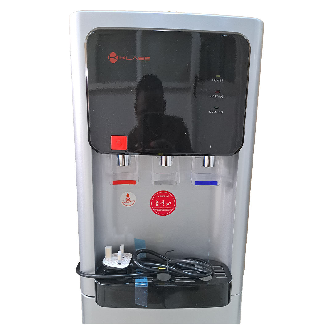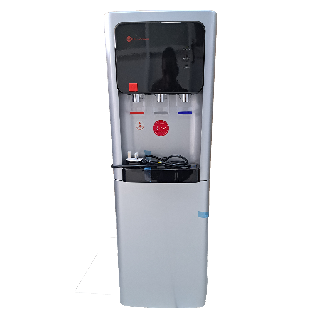 Key Features: KLASS Water Dispenser KL-3TGLC; Hot, Cold & Normal, 3-tap Top Loading With Bottom Fridge – Grey. 3 Faucet provides Hot, Normal & Cold Water Hot Water Child Safety Lock With Refrigerator Cabinet to keep your food safe and preserved This daily home utility appliance comes with a compact refrigerator to store food and beverages Anti-bacterial inner tank ensures safe drinking water Supports fast and easy cleaning efficiently Premium quality construction ensures durability Rated Voltage: 220V-240V~ Rated Frequency: 50-60Hz Rated Power: 580W Heating power: 500W Cooling Power: 80W Hot Water: 85-95 degrees Celsius Cold Water: 8-12 degrees Celsius Relative Humidity: <90% Refrigerant: 134a/32g Cooling Current: 0.8A Climate Class: T Child safety lock on hot water spout