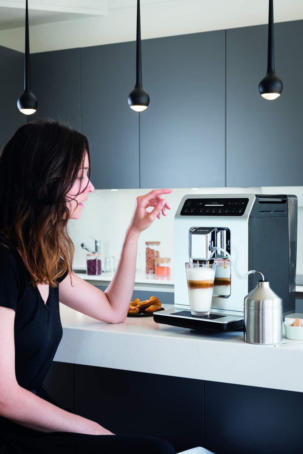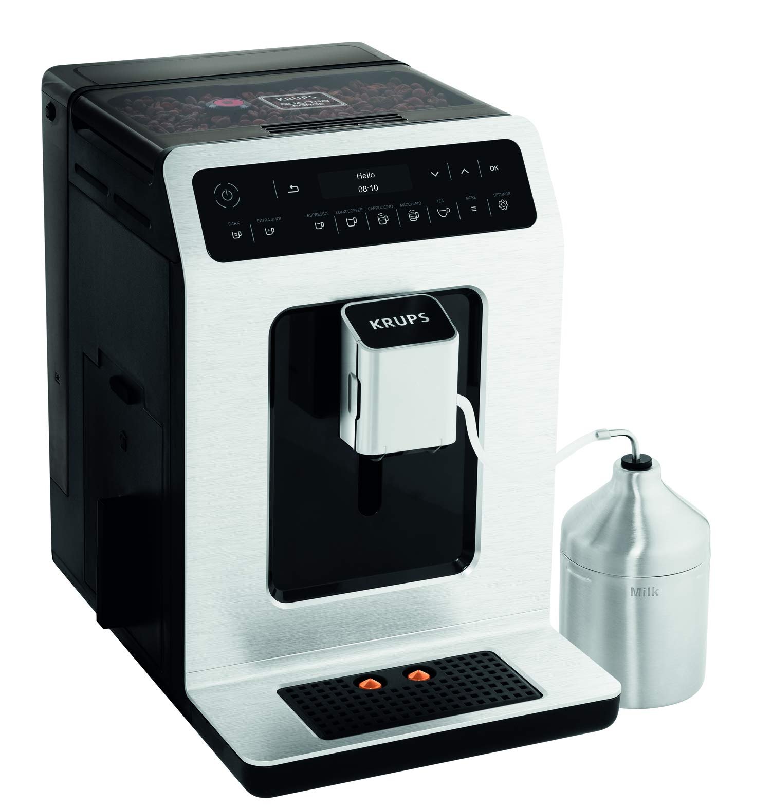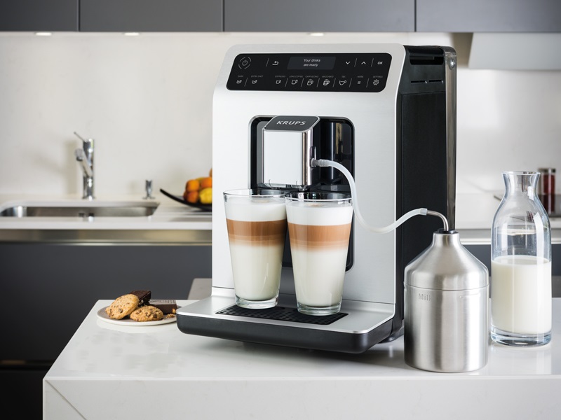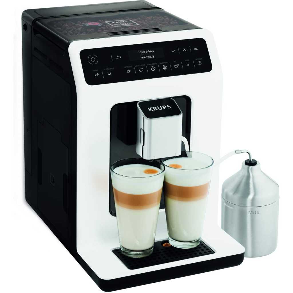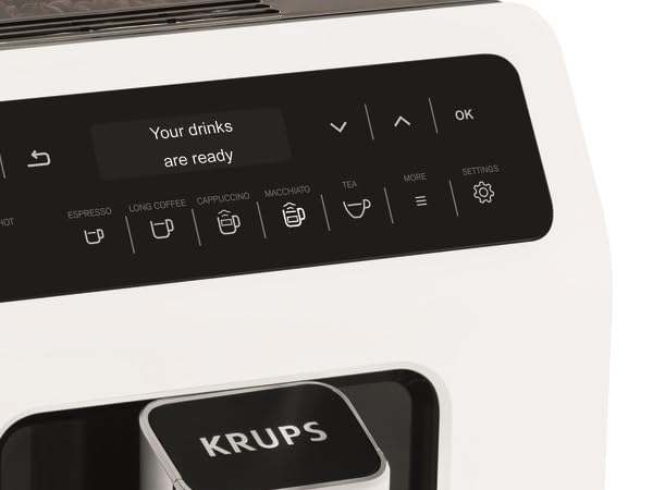 Key Features: KRUPS Evidence Milk EA891D27 Automatic Coffee Machine, Espresso, Cappuccino, 15 Drink Options, Bean to Cup, Tea. Double function lets you prepare two cappuccinos or lattes at once, quickly and easily Stylish espresso machine combines a modern aesthetic with a compact design to fit any kitchen Customisable coffee maker – add an extra shot for a bolder flavour or choose a darker drink for a more robust coffee OLED display and touch controls provide direct access to your drinks for ultimate ease of use
