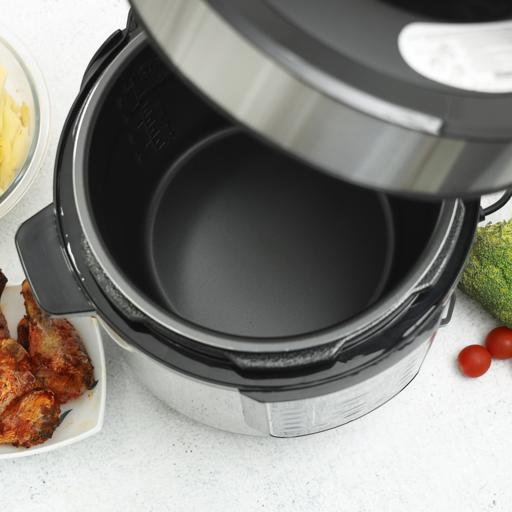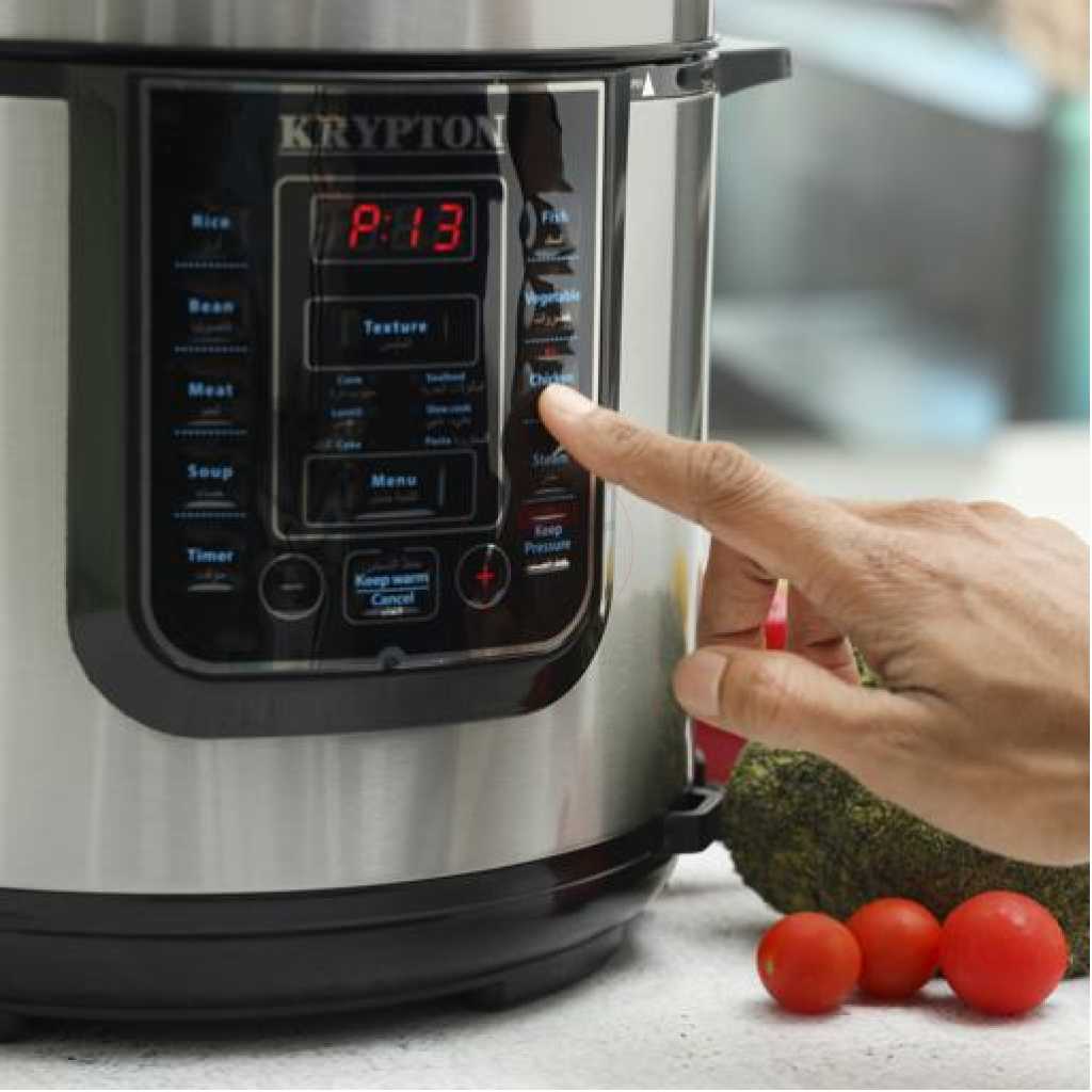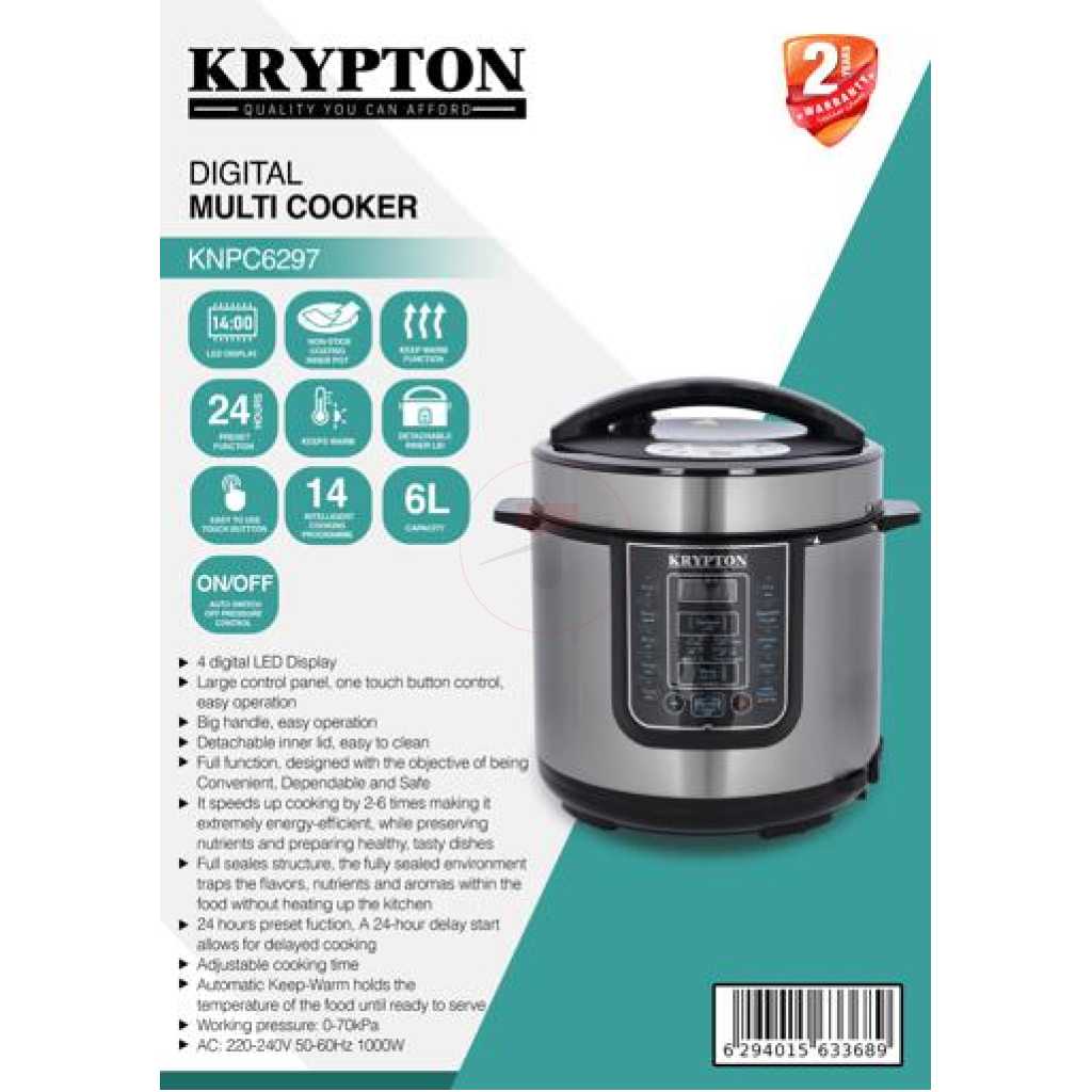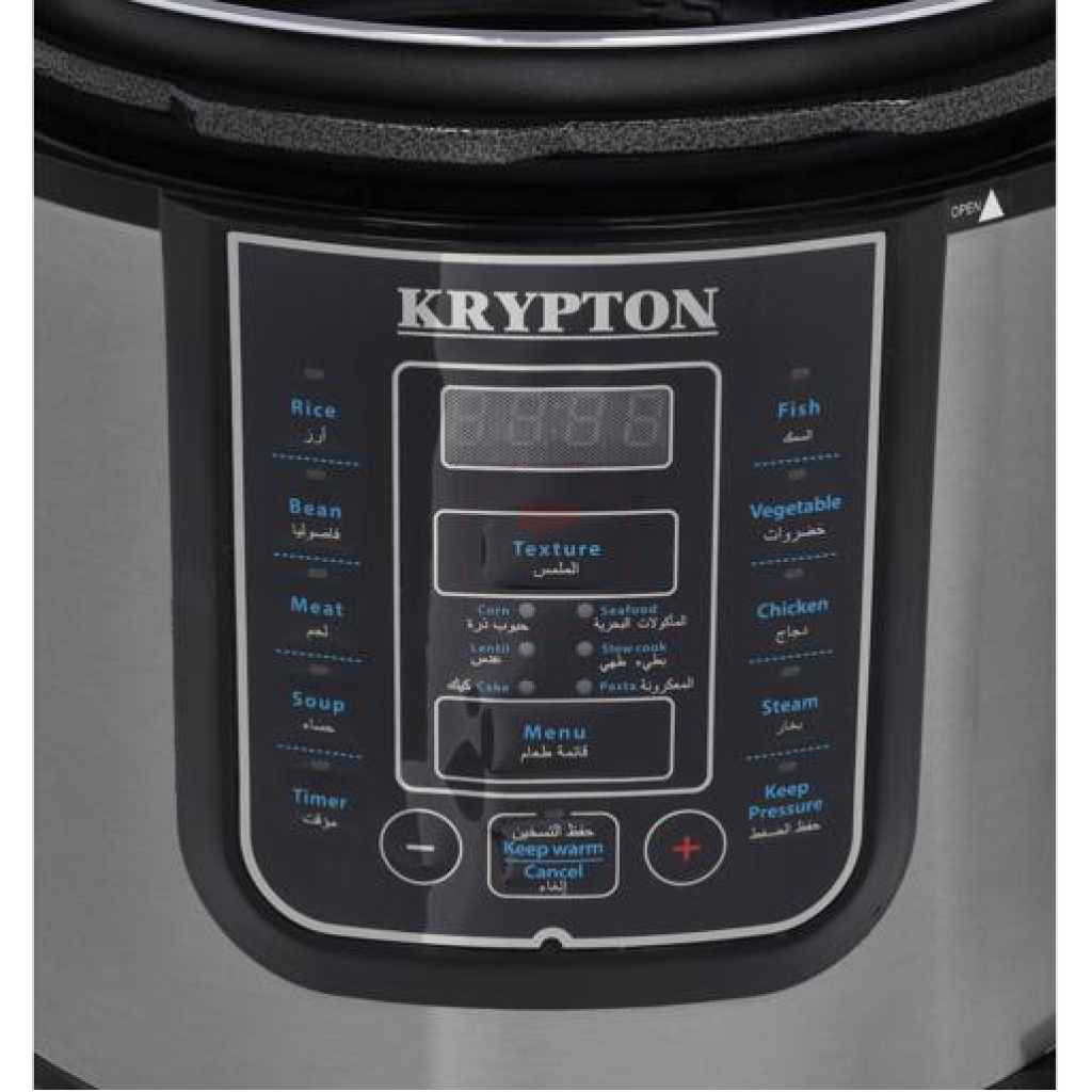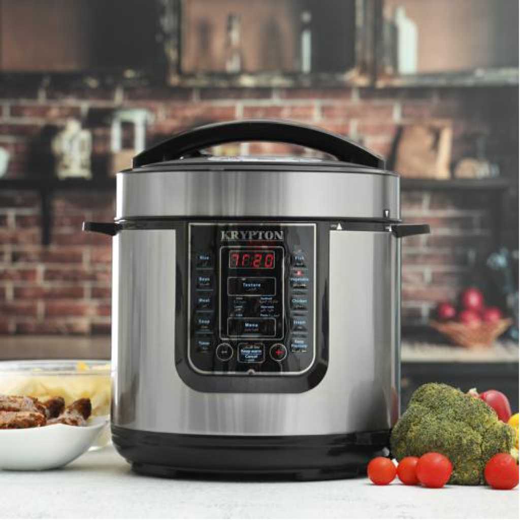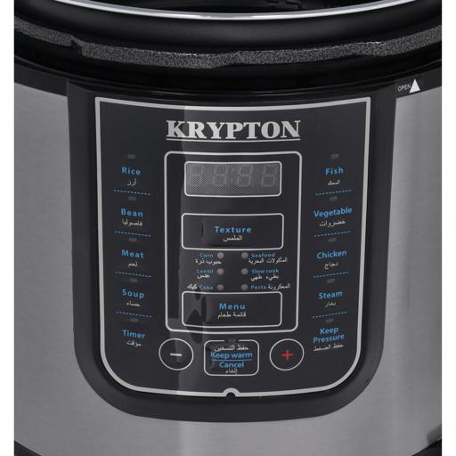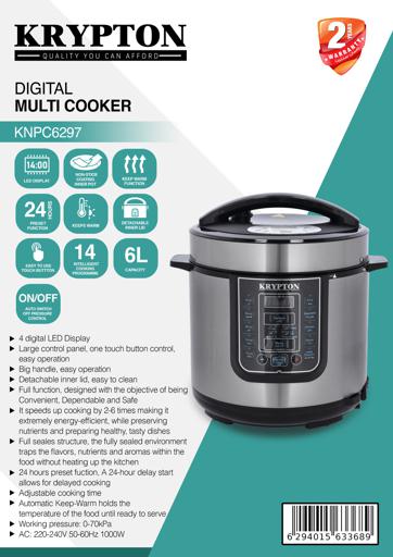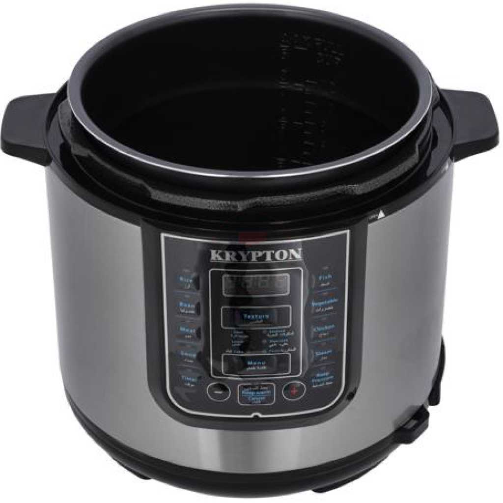 Key Features: Krypton 6 L Multi-functional Electric Rice, Pressure Cooker KNPC 6297, Silver Multi Function Automatic Cook One touch preset buttons/Automatic. Safe Lock Lid with Steam release/ Non stick Inner Pot. Replaces six common devices: Slow cooker, Canner, Soup Maker, Steamer, Cookware and Rice Cooker. Alumnium inner pot.