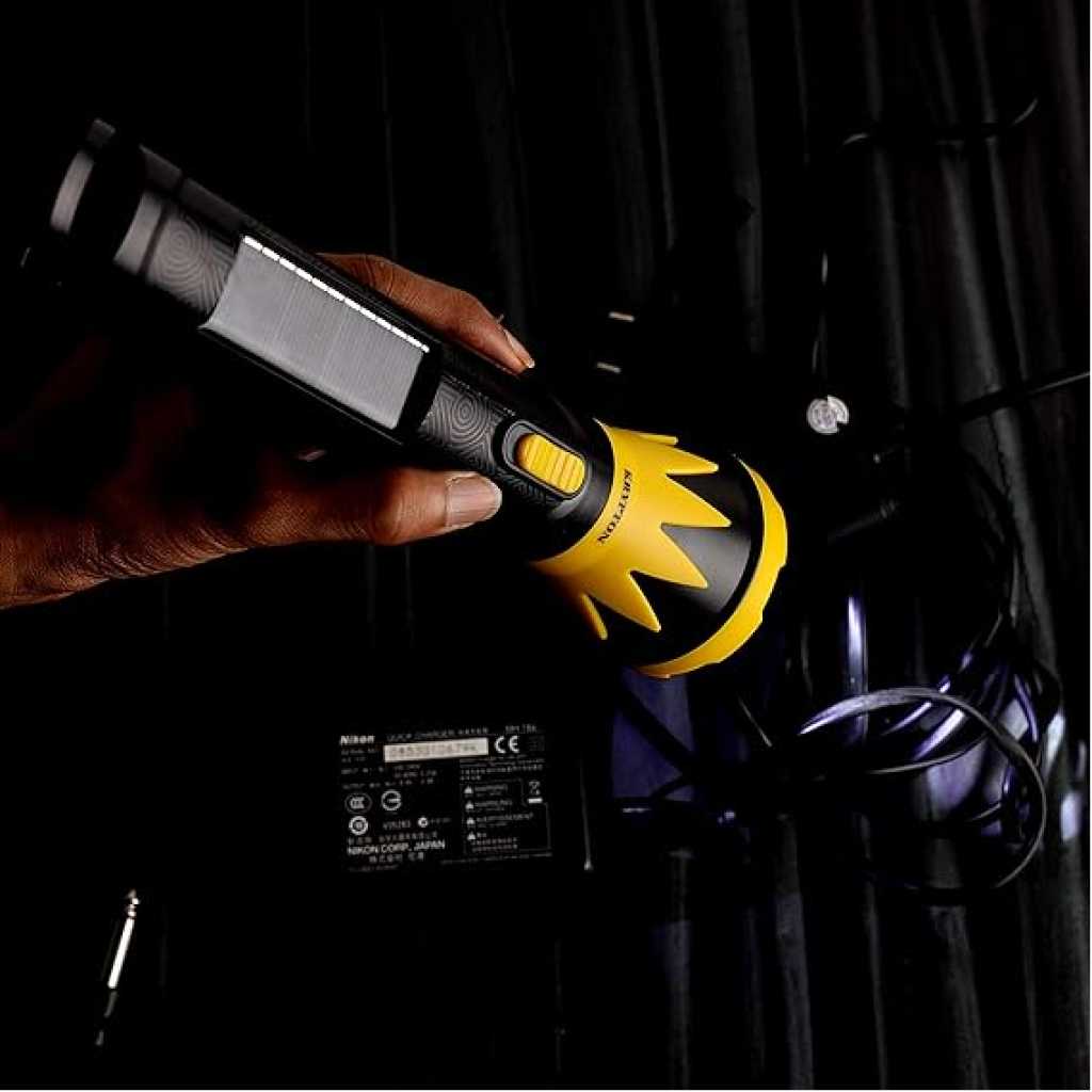 Key Features: Krypton Rechargeable LED Torch with Solar Panel- KNFL5159, Rechargeable and Easy to Use, Energy Efficient Design with Solar Panel and AC Charging, Compact, Portable and Light-Weight Design with 6 Hours Operating Time, Perfect for Indoor and Outdoor Use, Yellow and Black Rechargeable LED torch with a solar panel made with 3 W LED light. Energy efficient, compact, portable, and lightweight design. High brightness with long life. Rechargeable and easy to use. Strong and sturdy construction. Battery: 3.7V 1200mAh rechargeable Lithium battery. Charging time: 8-10 hours. Duration: 1.5 hours (strong light), 6 hours (weak light). Perfect for indoor and outdoor use. AC 220-240 V 50Hz.