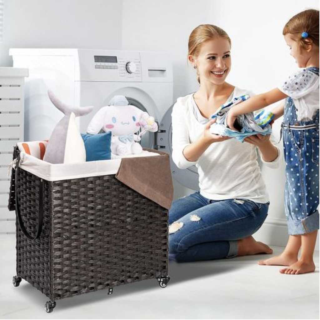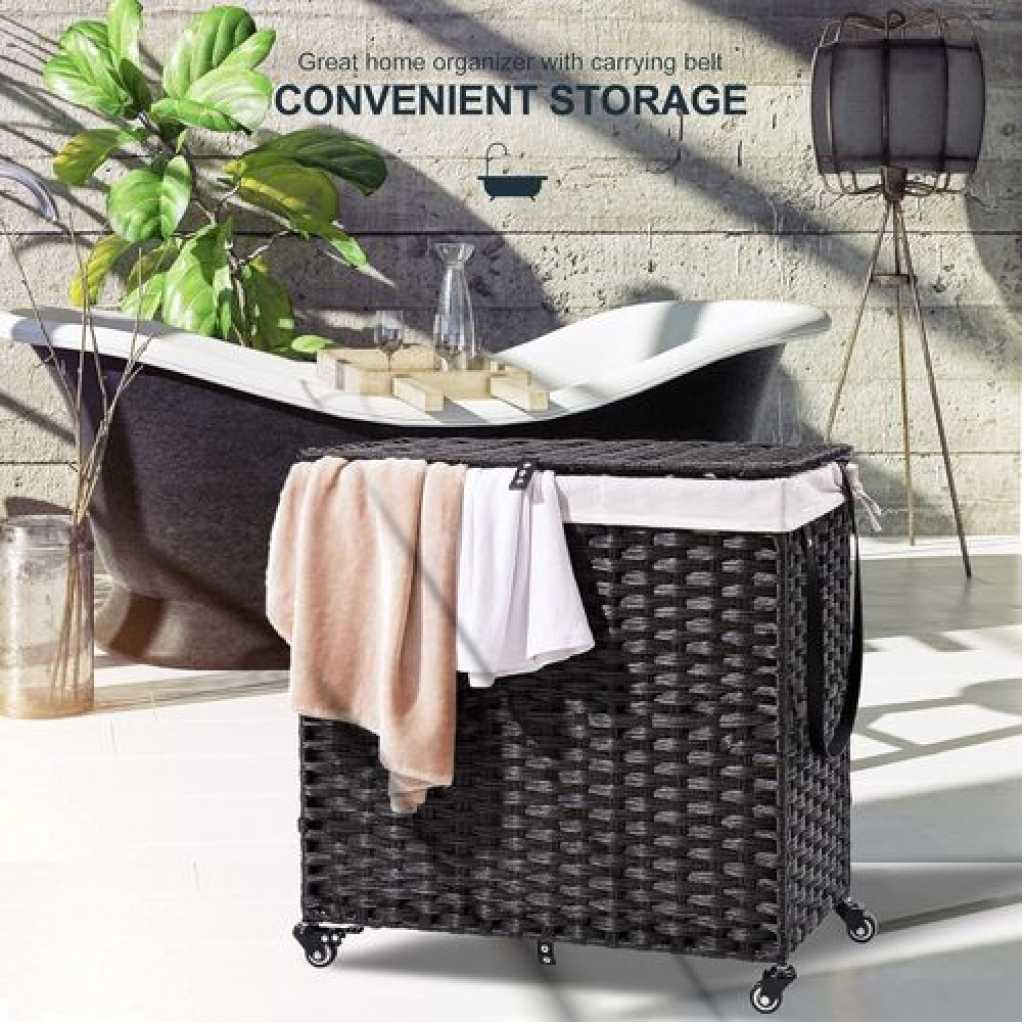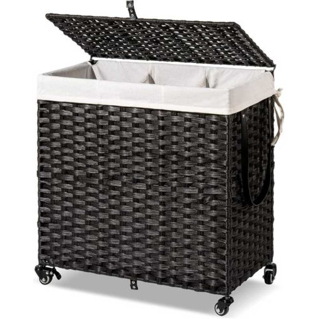 Handwoven Craftsmanship – Greenstell laundry hampers with wheels are made of durable synthetic rattan materials that are waterproof. The laundry basket with lid is made by professional craftsman, and each piece is unique, so there are subtle differences. Waterproof and adjustable foot pads are added to prevent the clothes from touching the floor. Bright natural veneers and delicate weaving, work well with any style of furniture design, lightweight and durable Wide Inner Space – 2 types of liner bag of different specifications – 2-section liner bag can hold larger pieces and more clothes in each grid, 3-section liner bag can easily sort clothes of different colors. The thickened wire frame on the laundry basket improves load bearing capacity and leaves more space inside. Added PU decorative handles, make it easy to open the hamper lid to put the dirty clothes into the basket, keeping your room tidy and clean Detachable and Washable Linings & Mesh Bags – Each laundry hamper with lid is equipped with 2 detachable liner bags, so the clothes can be conveniently taken out from the basket and transported to the washing machine. The 2 liner bags are convenient to move, wash and replace. The hamper lid hides the smelly clothes while keeping the dirty clothes invisible. 5 mesh laundry bags make washing easier and cleaner, which are suitable for bath towels, coats, jeans, underwear, socks and so on Home Companion – The liner bags are made of high-quality stitching process. Put the liner bag into the basket and support its top and make it open to reverse basket . The back lining strap is tied to the basket to prevent it from falling. It can easily hold up to 125L of clothing, making storage of clothing easy and relax. Clothes are easily separated with 5 mesh laundry bags, which can easily solve the problem Easy to assemble, large capacity – Convenient tools are equipped for easy installation. Large capacity 125L size: 25.6 (L) x 13.0 (W) x 25.2 (H) in. The laundry basket with double-sided Inscribed handle can easily move blankets, towels or daily clothes among different rooms. The maximum load capacity is 110LB