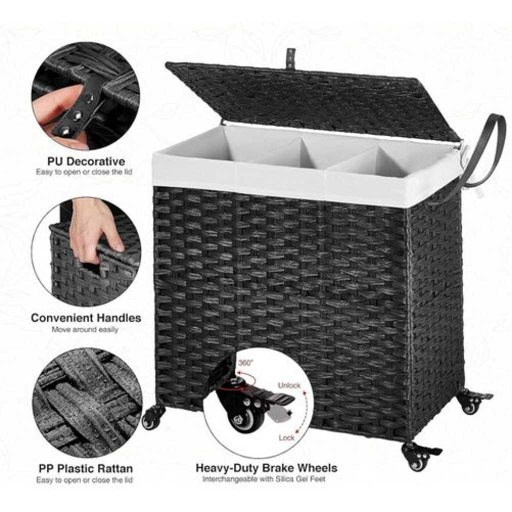 Key Features: Handwoven Craftsmanship – Greenstell laundry hampers with wheels are made of durable synthetic rattan materials that are waterproof. The laundry basket with lid is made by professional craftsman, and each piece is unique, so there are subtle differences. Waterproof and adjustable foot pads are added to prevent the clothes from touching the floor. Bright natural veneers and delicate weaving, work well with any style of furniture design, lightweight and durable Wide Inner Space – 2 types of liner bag of different specifications – 2-section liner bag can hold larger pieces and more clothes in each grid, 3-section liner bag can easily sort clothes of different colors. The thickened wire frame on the laundry basket improves load bearing capacity and leaves more space inside. Added PU decorative handles, make it easy to open the hamper lid to put the dirty clothes into the basket, keeping your room tidy and clean Detachable and Washable Linings & Mesh Bags – Each laundry hamper with lid is equipped with 2 detachable liner bags, so the clothes can be conveniently taken out from the basket and transported to the washing machine. The 2 liner bags are convenient to move, wash and replace. The hamper lid hides the smelly clothes while keeping the dirty clothes invisible. 5 mesh laundry bags make washing easier and cleaner, which are suitable for bath towels, coats, jeans, underwear, socks and so on Home Companion – The liner bags are made of high-quality stitching process. Put the liner bag into the basket and support its top and make it open to reverse basket . The back lining strap is tied to the basket to prevent it from falling. It can easily hold up to 125L of clothing, making storage of clothing easy and relax. Clothes are easily separated with 5 mesh laundry bags, which can easily solve the problem Easy to assemble, large capacity – Convenient tools are equipped for easy installation. Large capacity 125L size: 25.6 (L) x 13.0 (W) x 25.2 (H) in. The laundry basket with double-sided Inscribed handle can easily move blankets, towels or daily clothes among different rooms. The maximum load capacity is 110LB