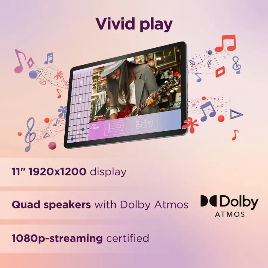 Vivid Play 11″, 1920x 1200, 90Hz, Netflix HD certified, Quad speakers with Dolby Atmos Learn Smarter Compatible Lenovo Tab Pen for note-taking, drawing, and more. Explore smarter on Nebo, MyScript Calculator 2 and other favorite inking apps with the Lenovo Tab Pen Up To Speed MediaTek Helio G88 Octa-core with up to 4GB+ 128GB All Day Power 7040 mAh battery, up to 10 hours of streaming, up to 15W fast charging Accelerated Learning Unlock multitasking with a split-screen and multi-windows at once. Learn more in less time! Immersive Reading Keep young curious minds focused and eye-safe while reading for hours with Lenovo’s Immersive Reading Mode and TUV eye care certified display. Learn Through The Cameras Facilitate the in-class experience through the 8MP Front camera, and smart document scanning through the rear camera. Search What You See With Google Lens Google Lens lets you search what you see, get stuff done faster, and interact with the world around you. Translate text, get help with homework, or quickly identify products, plants, and places. Seamless Collaboration Boost learning experiences with Lenovo Freestyle – transfer files, cast apps or create PC-like experience with an optional Bluetooth keyboard, effortlessly enabling a smart learning experience. Help Your Kids Discover, Create and Grow Google Kids Space on Lenovo tablets helps children discover, create and grow, recommending content based on their interests. Set boundaries and guide kids to quality content while keeping an eye on their screen time with Family Link parental controls. What’s Included Lenovo Tab M11, USB Type-C 2.0 Charging Cable, 5V/2A Charging Adapter, Quick Start Guide & Safety Warrant, MicroSD Card Pin