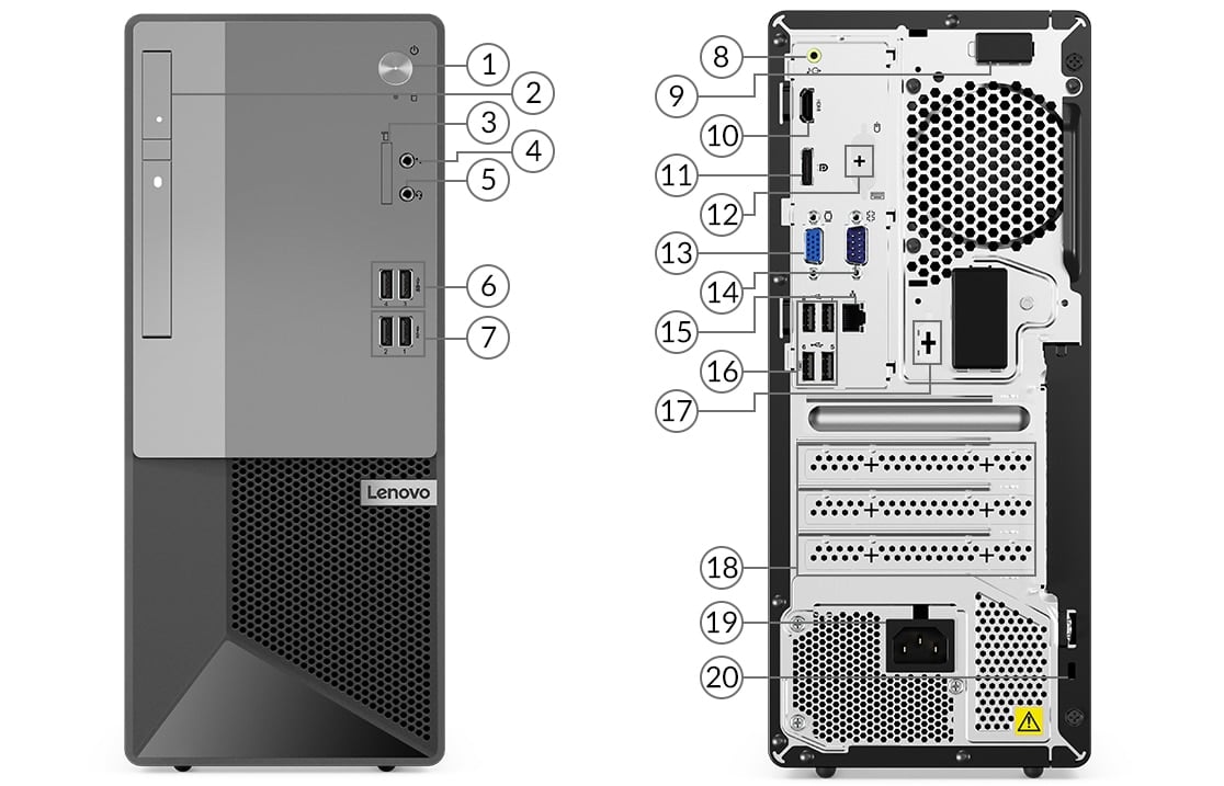 Lenovo V50T Desktop Intel Pentium G6405 4GB RAM 1TB HDD This stylish 13.6-liter desktop can update any office with a little IT budget. It provides the performance required by your workers to keep up with daily demands thanks to its strong Intel processors, BIOS-based and physical security features, and more effective cooling technologies. Additionally, there are numerous USB connections, including two conveniently located USB 3.2 Gen 1 and Gen 2 connectors at the front, for connecting necessary peripherals. With features like the optional Smart Cable Clip, which locks the cords physically and prevents unauthorized access, the Padlock Loop, which prevents tampering with internal components, and the Kensington lock slot, which guards against device theft, security is prioritized. Select M.2 SSD storage for faster application response times and performance, or HDD storage if you need to store substantial volumes of data. Ports and Slots Available 1Optional: Optical drive 11VGA 2Power button 124 x USB-A 2.0 3SD card reader 13RJ45 ethernet 4Mic 14Optional ports on expansion cards 5Headphone / mic combo 15Power in 62 x USB-A 3.2 Gen 1 16Smart cable clip 72 x USB-A 3.2 Gen 2 17Optional: 2 x PS/2 ports (keyboard / mouse) 8Audio out 18Serial 9HDMI 2.0 19Optional: Serial 10DisplayPort 1.4 20Kensington lock slot. PERFORMANCE Processor Intel Pentium Gold G6405 (2C / 4T, 4.1GHz, 4MB)