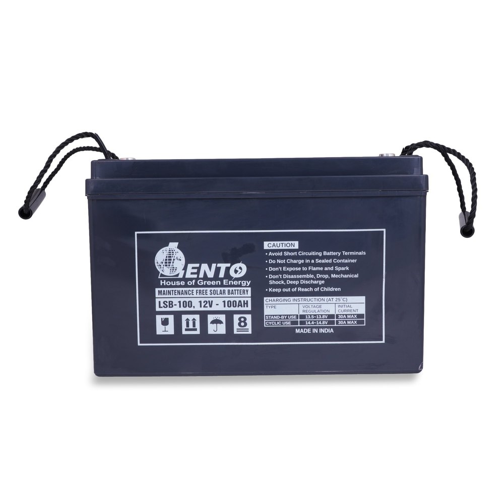 Lento 100AH 12V Solar Battery Sealed Maintenance-free Battery, Made in India. Amp Hours: 100AH Voltage (DC): 12V Positive plate with cyclic grid alloy for higher cycle life. Radial grids for low internal resistance, quick recharge, and high discharge performance. AGM Separator for Greater compression and longer life. Copper alloy screw-type terminals for better electrical conductivity, absolute positive contact, and zero wear & tear. Wide operating temperature range (-20°C to +50°C). Excellent deep discharge capability and ability to withstand frequent and long power failures. Low self-discharge for longer shelf life. High-impact PP/ABS container for better strength Lento Sealed Maintenance-free Batteries are the perfect solution when you want batteries that last for a long time and perform consistently throughout their life. The Lento Battery does not much emit corrosive acidic fumes so it’s safe to install doors. > No leakage, seepage, or spillage of electrolytes. > Can be installed in any application. > Life of the Lento battery is between 3-5 years depending upon the usage. > The self-discharge rate of the Lento battery is very low. Therefore, it has a much longer shelf life. > Available in factory-charged condition, so can be immediately used > Gets charged faster than other batteries due to its special features. Quicker useability for repeated application.