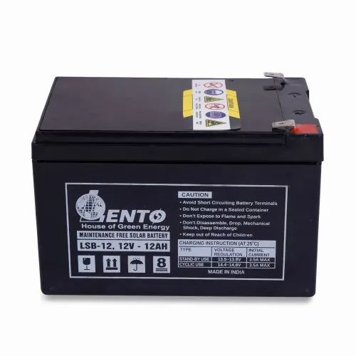 Lento 12AH 12V Solar Battery Sealed Maintenance-free Battery, Made in India. Amp Hours: 12AH Voltage (DC): 12V Positive plate with cyclic grid alloy for higher cycle life. Radial grids for low internal resistance, quick recharge, and high discharge performance. AGM Separator for Greater compression and longer life. Copper alloy screw-type terminals for better electrical conductivity, absolute positive contact, and zero wear & tear. Wide operating temperature range (-20°C to +50°C). Excellent deep discharge capability and ability to withstand frequent and long power failures. Low self-discharge for longer shelf life. High-impact PP/ABS container for better strength Lento Sealed Maintenance-free Batteries are the perfect solution when you want batteries that last for a long time and perform consistently throughout their life. The Lento Battery does not much emit corrosive acidic fumes so it’s safe to install doors. > No leakage, seepage, or spillage of electrolytes. > Can be installed in any application. > Life of the Lento battery is between 3-5 years depending upon the usage. > The self-discharge rate of the Lento battery is very low. Therefore, it has a much longer shelf life. > Available in factory-charged condition, so can be immediately used > Gets charged faster than other batteries due to its special features. Quicker useability for repeated application.