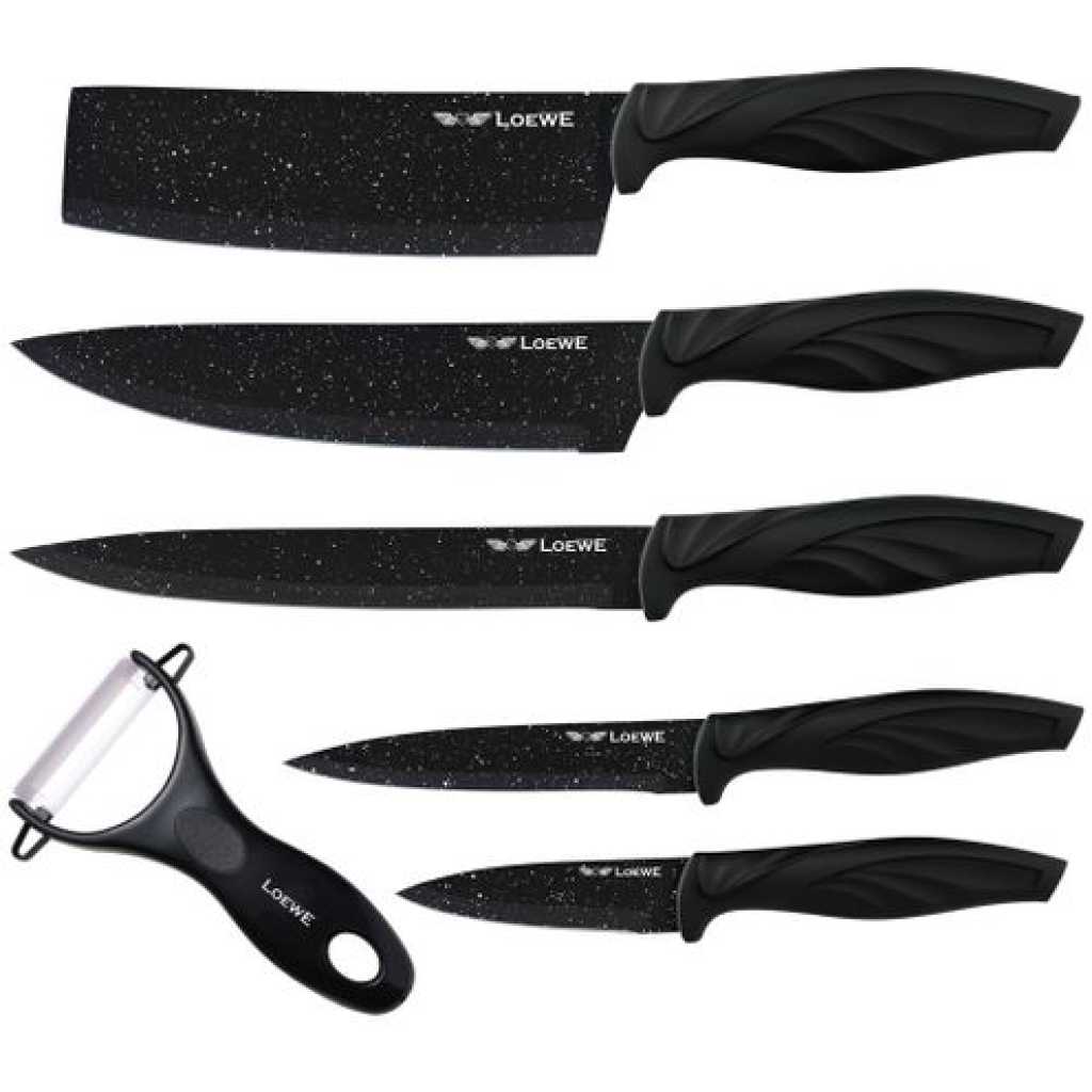 Key Features: A professional kitchen knife set that includes 5 knives, and 1 ceramic peeler. A fine set of kitchen knives The ergonomic non-slip handle feels comfortable to handle A superior quality material, rust-proof, easy to use and clean Robust, it performs well in slicing, dicing, chopping Includes: Chef Knife, Carving Knife, Small Knife, Peeling Knife, scissors and ceramic peeler.