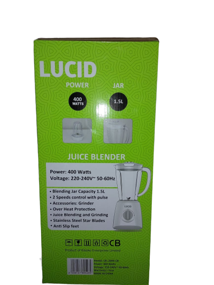 Buy Lucid Blender Model 2009-CB Make life easier in the kitchen by purchasing this 2-in-1 blender for mixing fruit and vegetables and meat, It has a stainless steel blade covered with a layer of silver that will allow you to use it without fear of rust. A blender is a kitchen and laboratory appliance used to mix, purée, or emulsify food and other substances. A stationary blender consists of a blender container with a rotating metal blade at the bottom, powered by an electric motor that is in the base. Power: 400watts Voltage: 220 – 240v – 50-60 Hz Blending Jar capacity: 2litres 2 speed control with pulse Accessories: Grinder Over Heat Protection Juice Blending and grinding Stainless steel star blades Anti-slip feet