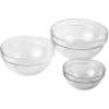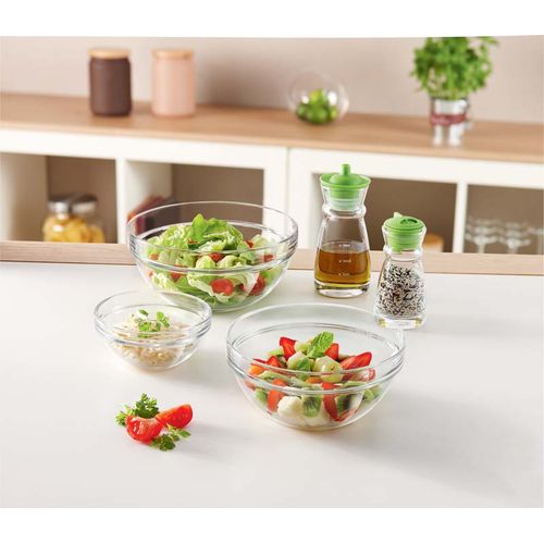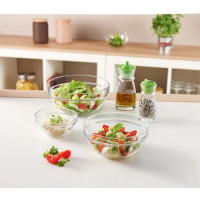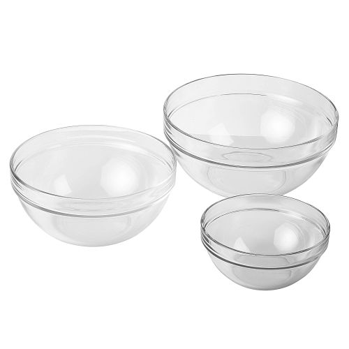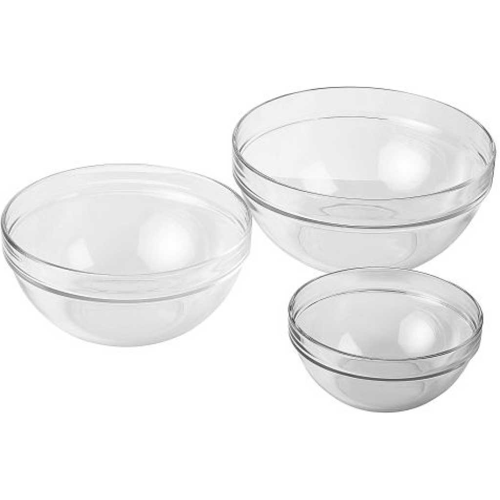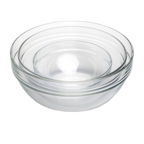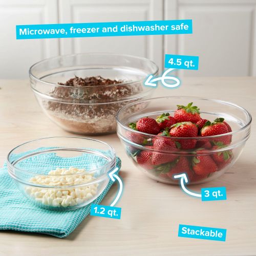 3 Piece mixing bowls Bowl with it! This Tasty 3 piece glass mixing bowl set offers up bowls in 3 sizes. They help make easy food preparation a reality in your humble kitchen. Mix up batter, whisk eggs and whip up some whipped cream using these tempered glass bowls. The bowls are nested and easily stackable for compact storage. Each bowl is microwave, freezer and dishwasher safe for versatility, so you can melt butter for your dough, freeze soup for an easy meal later and then throw it in the dishwasher to get clean. The glass bowls come in graduated sizes (1.2qt, 3qt and 4.5qt) so you can have the right size bowl for the job. The clear glass construction allows you to see the contents of each glass mixing bowl, so you don’t have to do any guesswork. The raised lip around each bowl helps you get a good grip on each bowl while mixing or whipping. Make a giant bowl of cereal or mix up some delicious brownie batter with this un-bowl-ievable mixing bowl set.Tempered glass prep bowlsNested and stackableMicrowave, freezer and dishwasher safeSet includes: 1.2 qt. mixing bowl, 3 qt. mixing bowl, 4.5 qt. mixing bowl