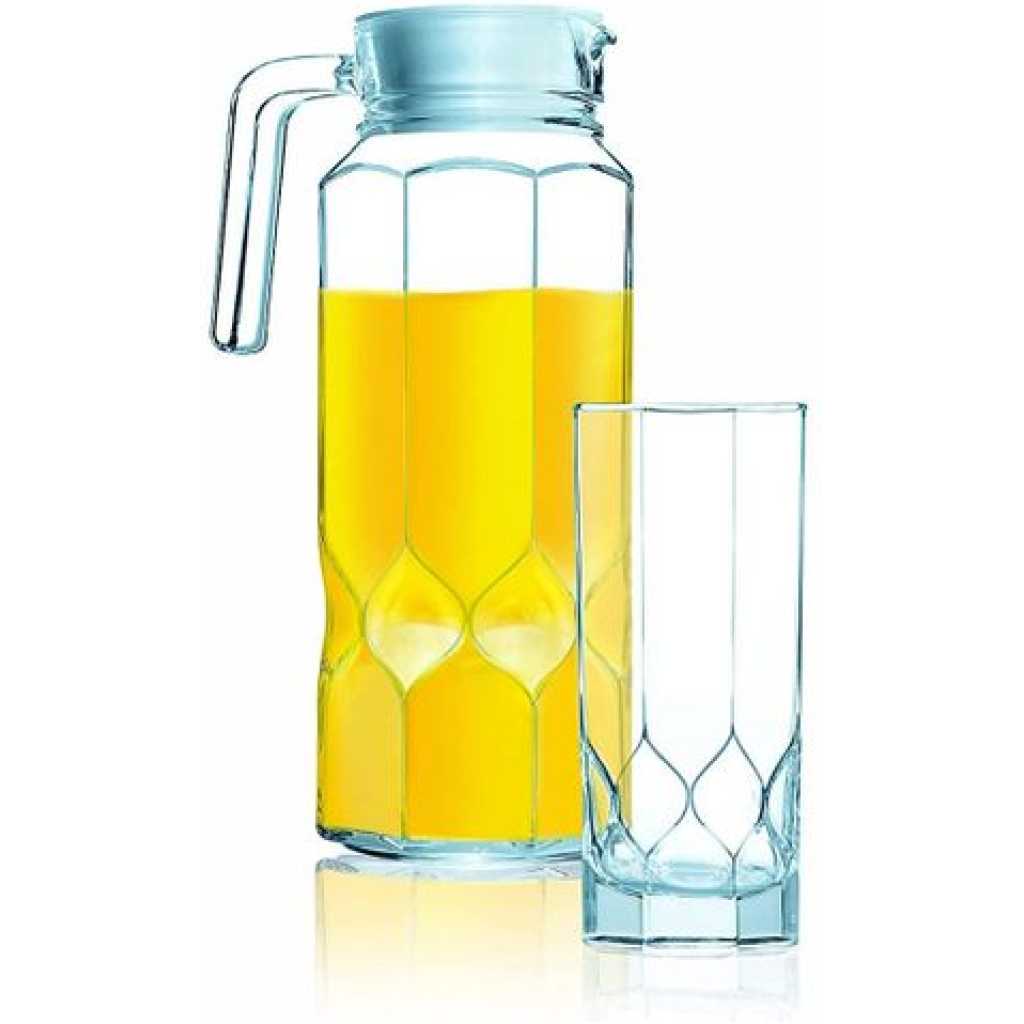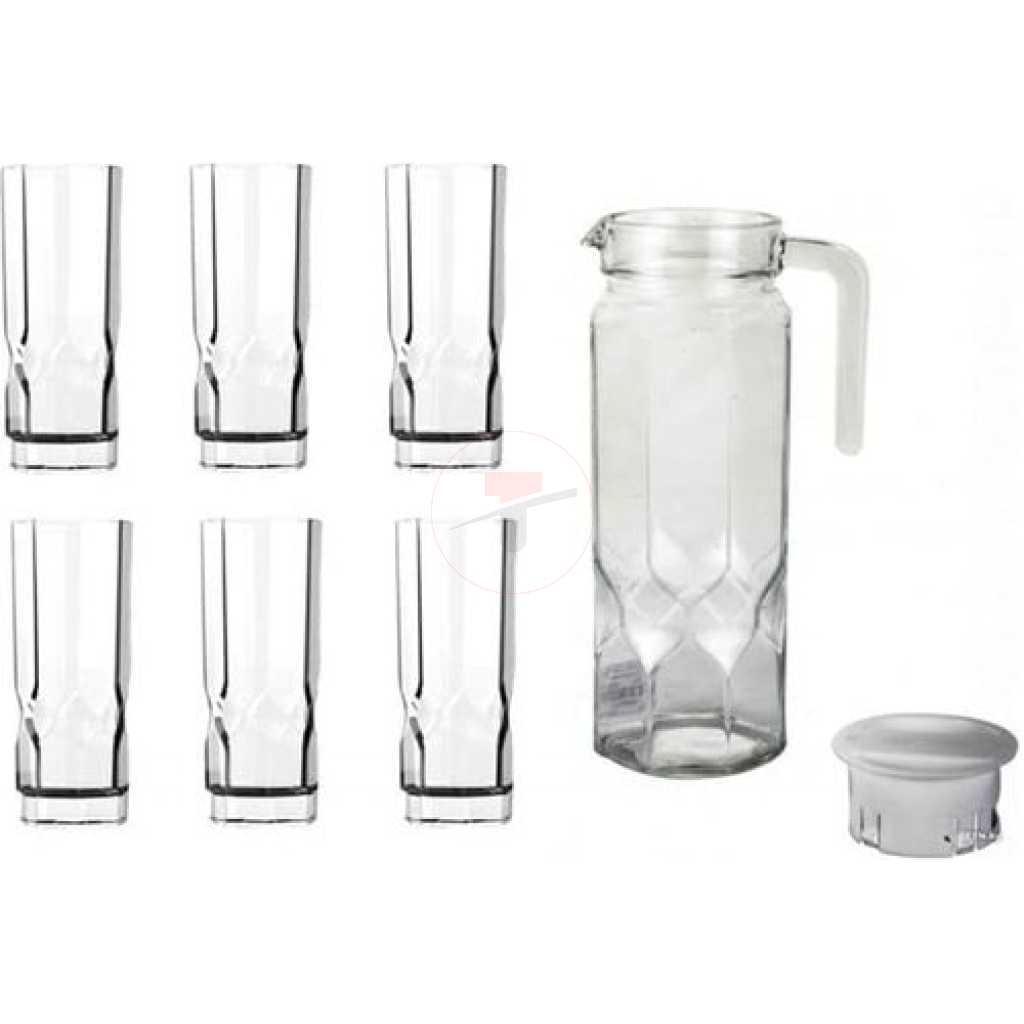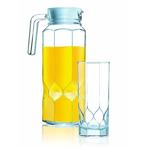 Key Features: Luminarc 7 Piece Octime Diamond Water & Juice Drinkware Set- Clear. Brand: Luminarc Drinkware Type: Everyday Drinkware Service Size: 6 Set Includes: 1 jug and 6 tumblers Dishwasher Safe: Yes Microwave Safe: Yes Color: Clear Material: Glass
