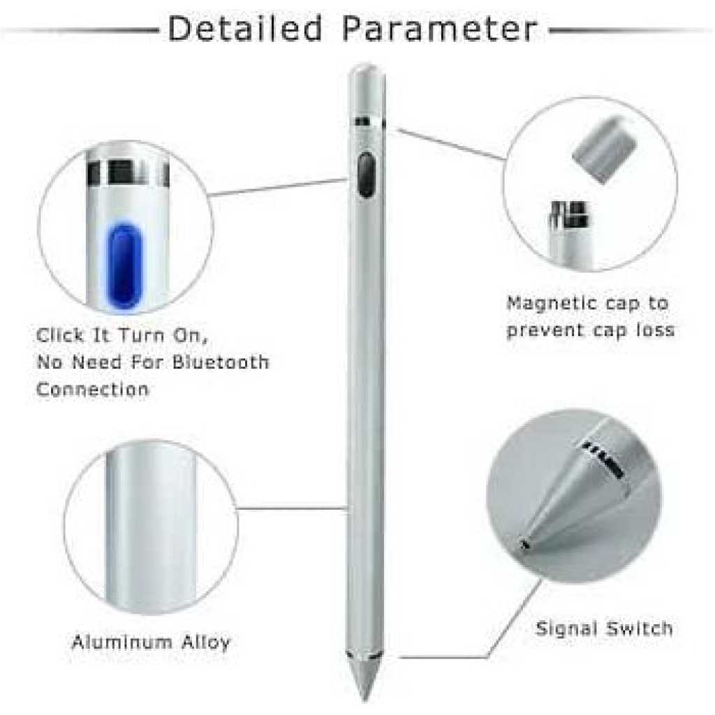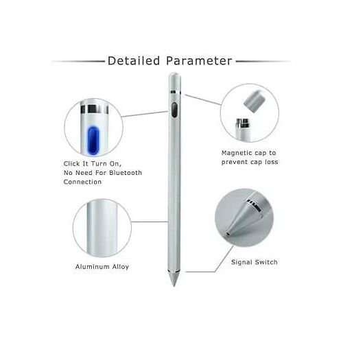 1. Precise Pen Tip: Experience precise positioning with the accurate 1.5mm non replaceable pen tip. The upgraded metal pen nib provides a quicker and smoother writing experience, making it more . 2. Easy Start: Simply press the power to start the active capacitive pen, no need for an APP or . You can easily record your ideas anytime, anywhere. 3. Magnetic Absorption Cap: Equipped with a magnetic absorption cap to prevent loss, dust, and water damage. The digital capacitive pen not only looks aesthetic but also effectively protects the charging port. 4. Fast Charging: Charge anytime with the USB cable, 80 to 100 minutes for a full charge, allowing continuous use for 8 to 10 hours on a single charge. If not in use, the touch pen automatically shuts off after 30 minutes. 5. Compatibility: Suitable for iOS and for Android tablets and smartphones, suitable for use with or without ideal for sketching, coloring, note taking, marking documents, and more. Specification: Item Type: Active Capacitive Pen Material: Aluminum Alloy Charging Time: About 80 to 100 Minutes Working Time: About 8 to 10 Hours Battery: 75400, 140mah, Lithium Battery (Shipped with Built in Battery) Power Saving: 30 Minutes Auto Power Off Standby Time: 3 Months Touch Rejection Function: None Tilt Pressure Sensitivity: None Side Adsorption: None Offset Effect: Offset 2 to 5mm Delay Effect: Delay 0.1 Second Process: Baked Paint Process Switch Mode: Side Charging Way: Micro Nib Diameter: Approx. 1.5mm/0.06in Body Diameter: Approx. 8.9mm/0.35in Total Length: Approx. 173mm/6.81in How to Use: Press the once, the blue LED light will turn on, indicating power on; press the again to power off, the LED light will off; the red LED light will indicate charging, and turn off when charging is complete.