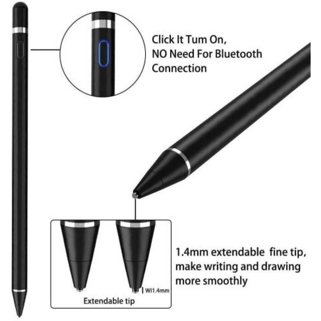 Key Features: Fast Charging: Charge anytime with the USB cable, 80 to 100 minutes for a full charge, allowing continuous use for 8 to 10 hours on a single charge. If not in use, the touch pen automatically shuts off after 30 minutes. Magnetic Absorption Cap: Equipped with a magnetic absorption cap to prevent loss, dust, and water damage. The digital capacitive pen not only looks aesthetic but also effectively protects the charging port. Precise Pen Tip: Experience precise positioning with the accurate 1.5mm non replaceable pen tip. The upgraded metal pen nib provides a quicker and smoother writing experience, making it more . Compatibility: Suitable for iOS and for Android tablets and smartphones, suitable for use with or without ideal for sketching, coloring, note taking, marking documents, and more. Easy Start: Simply press the power to start the active capacitive pen, no need for an APP or . You can easily record your ideas anytime, anywhere.