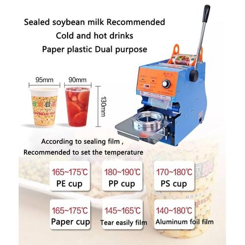 Uniform heating, combined with a film cutter, the incision is neat, and the sealing film does not leak The cup holder can be adjusted up and down to meet the sealing film of cups of different heights, and the cup with a height of 19cm can be sealed by removing the cup holder Product parameters: Material: alloy + aluminum Power: 300W Maximum seal cup height: 18cm/7in Cup diameter: 90mm/95mm Output: about 300-500cup/h Temperature range: 0-250℃/0-482℉ Cup material: paper cup/plastic cup Package includes: cup sealing machine, power cord, cup ring A high quality sealer machine can save you time and money but picking the right one can be hard to do. There are a lot of to choose from and the price can change a lot too. Are essential for bubble tea shops, juice shops or any place that serves drinks. Automatic sealers are also faster than using regular lids and use less plastic which is one of the reasons why they’re becoming so popular. They work by creating an airtight seal on whatever kind of cup or container that you use. They can be used to seal both hot and cold drinks, yogurt, soup, cosmetics and more! Plastic cups can be sealed with a variety of materials: PE, PP, PC, and 90-95 calibers can be sealed. The cup sealer machine provides a 90-circle. If you need to seal 90 cups, you can put it in to seal. FULL AUTOMATIC: After placing the cup, the cup sealing machine automatically feeds the cup, automatically rolls the film, automatically seals the cup, automatically ejects, and takes it away directly. The cup sealer machine also has an automatic count, you can check how many cups are sealed each day. Fast cup sealing speed, fully automatic solution to milk tea shop with fewer staff, burst orders, and reject customer loss. 90 OR 95MM CUPS, FOR LOTS OF CUP MATERIALS: High and short cups are available, can seal any height within 18CM/7.1IN. The cup sealing machine is universal for paper and plastic, and only needs to be equipped with special film for paper and plastic. SEAL THE CUP WITHOUT LEAKING: Accurately set the temperature, 24 hours a day without interruption, 500-650 cups can be sealed per hour. “Dual mode all-in-one machine” is switched manually and automatically with one key to cope with different passenger flows when using the cup sealing machine. ALL-TIME TECHNICAL GUIDANCE: The cup sealing machine has covered all the necessary components. If you need operation videos and troubleshooting guidance videos, as well as one-stop consumables and accessories, and bar equipment problems, please feel free to contact us by email. Fully automatic: After inserting the cup, the cup sealing machine automatically enters the cup, automatically rolls the film, automatically closes the cup, automatically ejects it and takes it away immediately. 【Applicable Cup Size】High and low cups are available, and the maximum sealing height is 20 cm. The cup sealing machine is suitable for paper cups and PP plastic cups. It only needs to be provided with special films for paper and plastic. Sealable caliber 70/75/88/89/90/95 mm. Automatic accurate count, adjustable from 0-250°C. 【Seal the cup without leaking】Set the temperature accurately, 24 hours a day without interruption, 400-600 cups can be sealed per hour. Double positioning pin protection, effectively preventing damage to the tooth blade; unique double cup structure for free matching. Low noise: Create a comfortable working environment and improve work efficiency. Bearing roll film and high-quality lift shaft design. 【Areas of application】Cup Sealer is ideal for sealing takeaway drinks such as bubble tea, milk, smoothies, soy and coffee. Widely used in restaurants, boba shops, kitchens, coffee shops, tea houses, bakeries, beverage shops and beverage factories.
