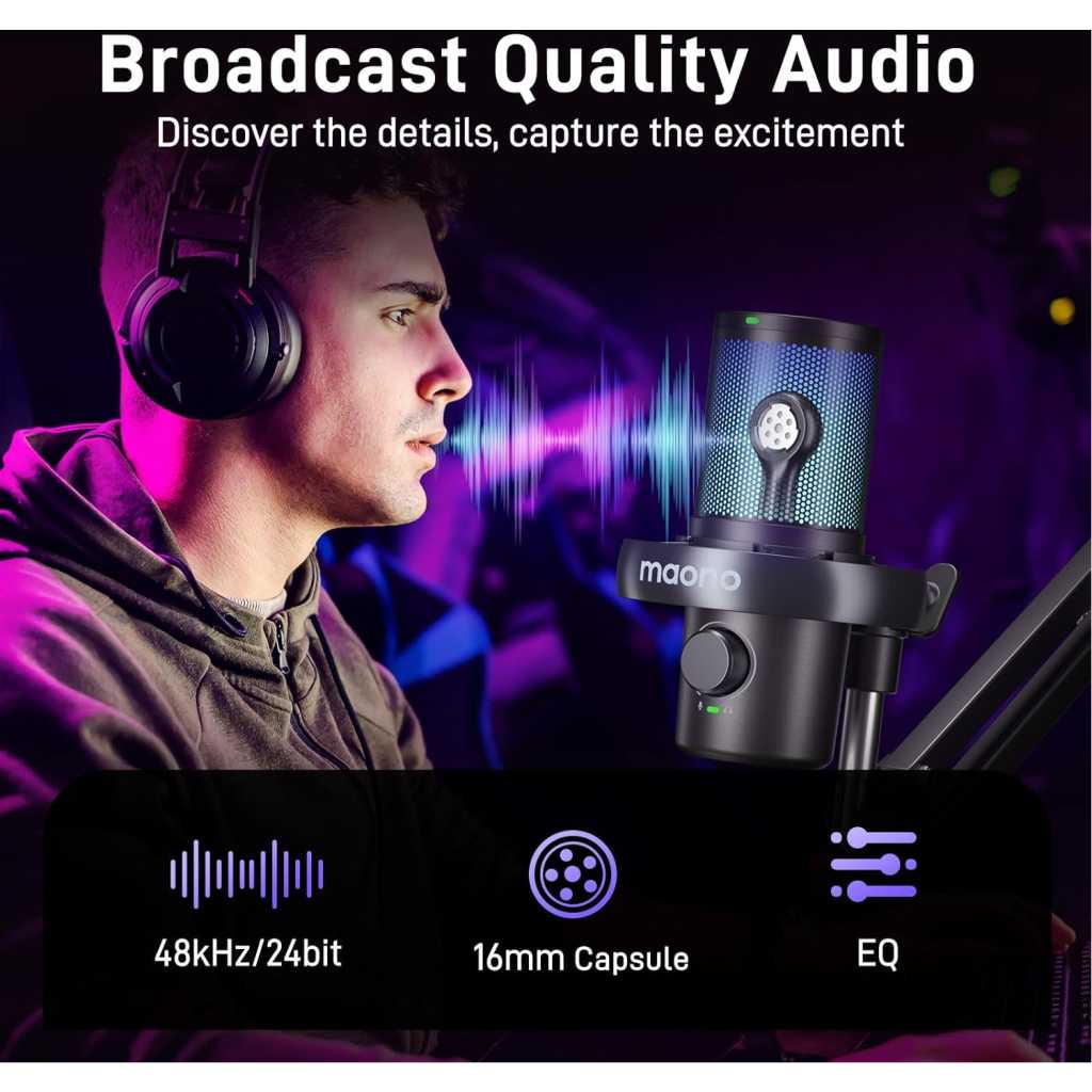 Instant Wireless Connection: DM40 Pro Wireless Condenser microphones offer unmatched freedom with no cables to limit your movement, making them ideal for gamers, streamers, and content creators. With up to 75 hours of battery life, you can enjoy long, uninterrupted sessions without worrying about recharging. They provide flexibility, easy setup, and reliable performance across various environments. Whether you’re gaming or streaming, wireless microphones ensure a seamless, high-quality audio experience One-tap Noise Cancellation: This gaming microphone features a one-touch noise cancellation button with four preset levels—Low, Medium, and High—along with a customizable noise level. You can adjust the settings directly on the mic or through the accompanying maono link, offering flexibility to suit different environments. Whether you’re gaming, streaming, or recording, you can easily fine-tune the noise cancellation to ensure crystal-clear and professional audio with minimal interference Broadcast-Quality Sound: The USB microphone delivers crystal-clear, professional audio with stunning detail and precision, perfect for podcasts, streaming, voiceovers, and broadcasting. With rich, natural sound reproduction, it captures every nuance of your voice, providing listeners with an immersive, high-fidelity experience. This superior sound quality enhances your credibility, keeps your audience engaged, and ensures your message comes across loud and clear AI Voice Change: The DM40 Pro wireless microphone offers 10 exciting AI voice-changing modes, giving you endless possibilities to transform your voice! Whether you want to sound like a game character, or a superhero, or imitate your favorite voices, it’s all easily achievable. Perfect for gaming, streaming, or chatting with friends, AI voice change brings creativity and fun to every conversation. Say goodbye to the usual, explore unique sound effects Easy Control & Monitoring: The Maono Link app gives you complete control over your condenser microphone, allowing you to effortlessly manage all your recording needs. With just one tap, you can adjust scene presets, EQ settings, AI voice changers, noise cancellation, volume, gain, mute, zero-latency monitoring, and RGB lighting. Whether you’re streaming, gaming, or recording, everything is at your fingertips, making your audio sessions smooth, flexible, and entirely under your control Plug and Play & Wide Compatibility: The podcast microphone features both USB and USB-C wireless plugs, ensuring seamless compatibility with computers, PCs, laptops, phones, and Macs. Simply plug it in, and you’re ready to go! Enjoy smooth, uninterrupted recording and playback, perfect for all kinds of recording scenarios—whether it’s for short video shoots, voiceovers, lifestyle vlogs, live streaming, mukbangs, meetings, interviews, online classes, or even singing sessions 16M+ Configurable Colors: Fully customize your setup with endless color options! Add a vibrant, personalized touch to your space, enhancing the atmosphere for gaming, streaming, podcasting or recording. Adjust the lighting to match your mood or environment, creating an immersive experience. Whether you prefer subtle tones or dynamic effects, the customizable RGB lighting turns your mic into more than just a tool—it becomes a stylish, eye-catching centerpiece that elevates your entire setup Powerful & Easy to Use: The wireless USB condenser microphone gives you total control over your sound with its mute, gain, and monitoring features. One-touch mute instantly silences the mic, eliminating any unwanted interruptions. Adjust the gain to fine-tune the volume for perfect sound, and enjoy zero-latency monitoring for real-time feedback, so you always know how you sound. Whether you’re streaming, gaming, or recording, this microphone ensures clear, natural audio every time!