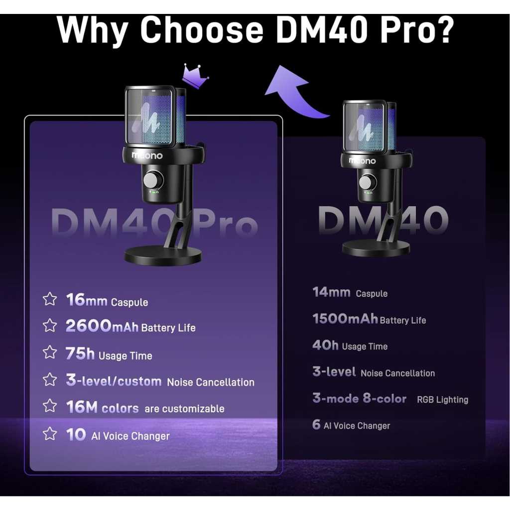 Key Features: Instant Wireless Connection: DM40 Pro Wireless Condenser microphones offer unmatched freedom with no cables to limit your movement, making them ideal for gamers, streamers, and content creators. With up to 75 hours of battery life, you can enjoy long, uninterrupted sessions without worrying about recharging. They provide flexibility, easy setup, and reliable performance across various environments. Whether you’re gaming or streaming, wireless microphones ensure a seamless, high-quality audio experience One-tap Noise Cancellation: This gaming microphone features a one-touch noise cancellation button with four preset levels—Low, Medium, and High—along with a customizable noise level. You can adjust the settings directly on the mic or through the accompanying maono link, offering flexibility to suit different environments. Whether you’re gaming, streaming, or recording, you can easily fine-tune the noise cancellation to ensure crystal-clear and professional audio with minimal interference Broadcast-Quality Sound: The USB microphone delivers crystal-clear, professional audio with stunning detail and precision, perfect for podcasts, streaming, voiceovers, and broadcasting. With rich, natural sound reproduction, it captures every nuance of your voice, providing listeners with an immersive, high-fidelity experience. This superior sound quality enhances your credibility, keeps your audience engaged, and ensures your message comes across loud and clear AI Voice Change: The DM40 Pro wireless microphone offers 10 exciting AI voice-changing modes, giving you endless possibilities to transform your voice! Whether you want to sound like a game character, or a superhero, or imitate your favorite voices, it’s all easily achievable. Perfect for gaming, streaming, or chatting with friends, AI voice change brings creativity and fun to every conversation. Say goodbye to the usual, explore unique sound effects Easy Control & Monitoring: The Maono Link app gives you complete control over your condenser microphone, allowing you to effortlessly manage all your recording needs. With just one tap, you can adjust scene presets, EQ settings, AI voice changers, noise cancellation, volume, gain, mute, zero-latency monitoring, and RGB lighting. Whether you’re streaming, gaming, or recording, everything is at your fingertips, making your audio sessions smooth, flexible, and entirely under your control Plug and Play & Wide Compatibility: The podcast microphone features both USB and USB-C wireless plugs, ensuring seamless compatibility with computers, PCs, laptops, phones, and Macs. Simply plug it in, and you’re ready to go! Enjoy smooth, uninterrupted recording and playback, perfect for all kinds of recording scenarios—whether it’s for short video shoots, voiceovers, lifestyle vlogs, live streaming, mukbangs, meetings, interviews, online classes, or even singing sessions 16M+ Configurable Colors: Fully customize your setup with endless color options! Add a vibrant, personalized touch to your space, enhancing the atmosphere for gaming, streaming, podcasting or recording. Adjust the lighting to match your mood or environment, creating an immersive experience. Whether you prefer subtle tones or dynamic effects, the customizable RGB lighting turns your mic into more than just a tool—it becomes a stylish, eye-catching centerpiece that elevates your entire setup Powerful & Easy to Use: The wireless USB condenser microphone gives you total control over your sound with its mute, gain, and monitoring features. One-touch mute instantly silences the mic, eliminating any unwanted interruptions. Adjust the gain to fine-tune the volume for perfect sound, and enjoy zero-latency monitoring for real-time feedback, so you always know how you sound. Whether you’re streaming, gaming, or recording, this microphone ensures clear, natural audio every time!