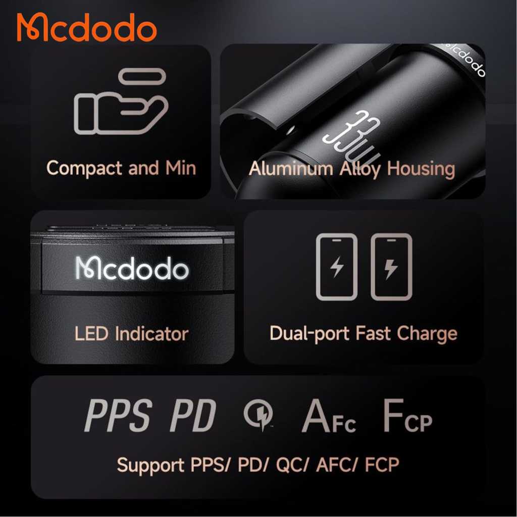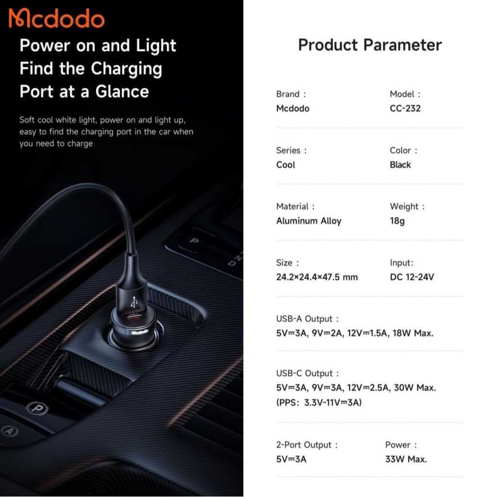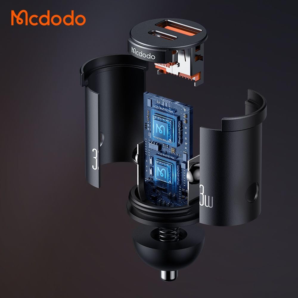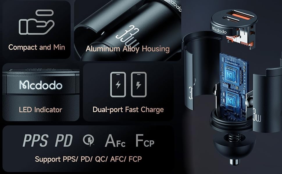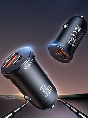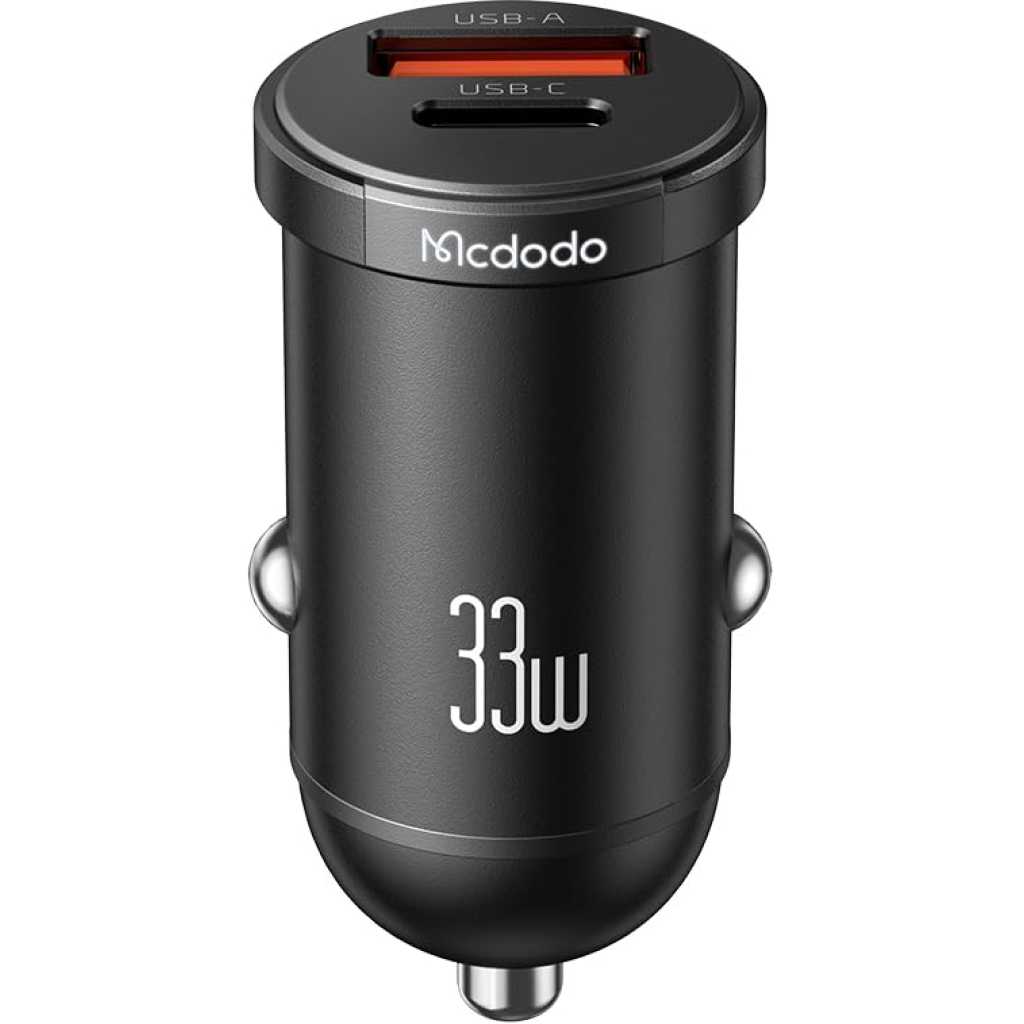 Key Features: High-Speed Dual Charging: Equipped with both USB-A and USB-C ports, this car charger supports fast charging with a total output of 33W, allowing you to charge two devices simultaneously at high speed. Wide Compatibility: The smart IC technology ensures compatibility with various fast charging protocols, including PD3.0, FCP/SCP, AFC, QC3.0, as well as Apple 2.4 and Samsung 2A, making it versatile for different devices. Compact and Lightweight Design: With a size of 24.224.447.5mm and a weight of only 18g, this car charger is easy to store and carry, fitting seamlessly into your car’s charging port without adding bulk. Durable Materials: Made from high-quality aluminum alloy, this car charger is built to last, providing reliable performance even with frequent use and ensuring durability over time. LED Indicator: The built-in LED indicator provides a convenient way to check the charging status and makes it easy to locate the charger in low-light conditions, enhancing usability and convenience.