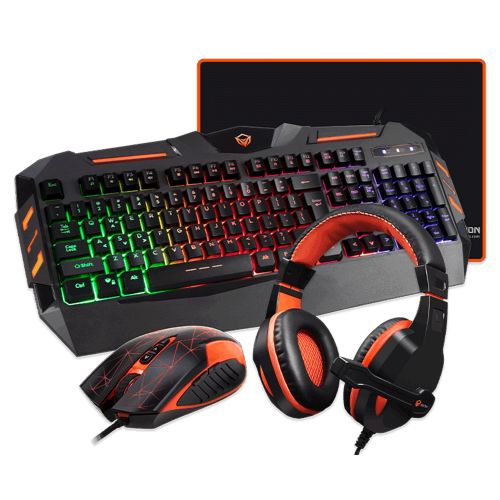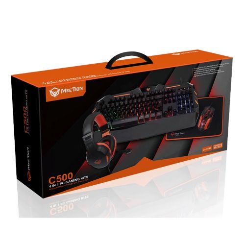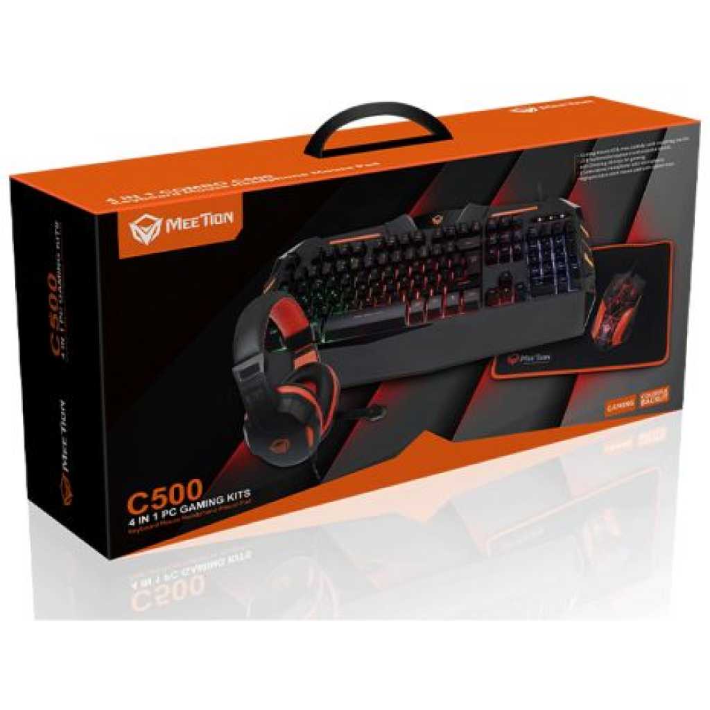 Meetion 4 in 1 Gaming Keyboard Mouse and Headset Bundle with Mouse Pad. MEETION C500 – 4 IN 1 PC GAMING KIT Meetion Gaming Keyboard 1) Colorful backlit with breather. 2) Comfortable and soft keys, Suitable for gamers3) Error-free running time, strokes: more than 10 000 000. 4) 19 keys anti-ghosting5) Compatible with Windows XP/Vista/7/8/10, Mac OS. 6) 12 Fn shortcut buttons for Multimedia, Internet, etc. 7) Gold plating USB Interfacе”.Meetion Gaming Mouse 1) Variable highlight. 2) Ergonomic symmetric design for Right/Left hand. 3) Soft touch, Two additional navigation buttons (Forward and Back). 4) Precision optical sensor A704. 5) DPI switch,resolution: 800-3200DPI. 6) Error-free running time, strokes: more than 3,000,000. 7) OS compatibility: Windows XP/Vista/7/8/10. 8) Number of keys: 7 + 1 (scroll wheel). Meetion Gaming Headpset1) Comfortable leather ear covers. 2) Adjustable leather headband. 3) High fidelity sound quality stereo unit: Speaker unite Φ40mm, Sensitivity 110db, Impedance 32Ω, Frequency 20Hz~20KHz. 4) High sensitivity microphone: Sensititivity -58dB±3dB, Omini-directional, input power 50mW. Volume controller. 5) 2*3.5mm stereo audio connector. Meetion Gaming Mouse PadCloth surface for high performance. Non-slip natural rubber back. Optical-friendly mouse pad for improved tracking. Dimensions: 320*240*5mm. Weight: 150g.