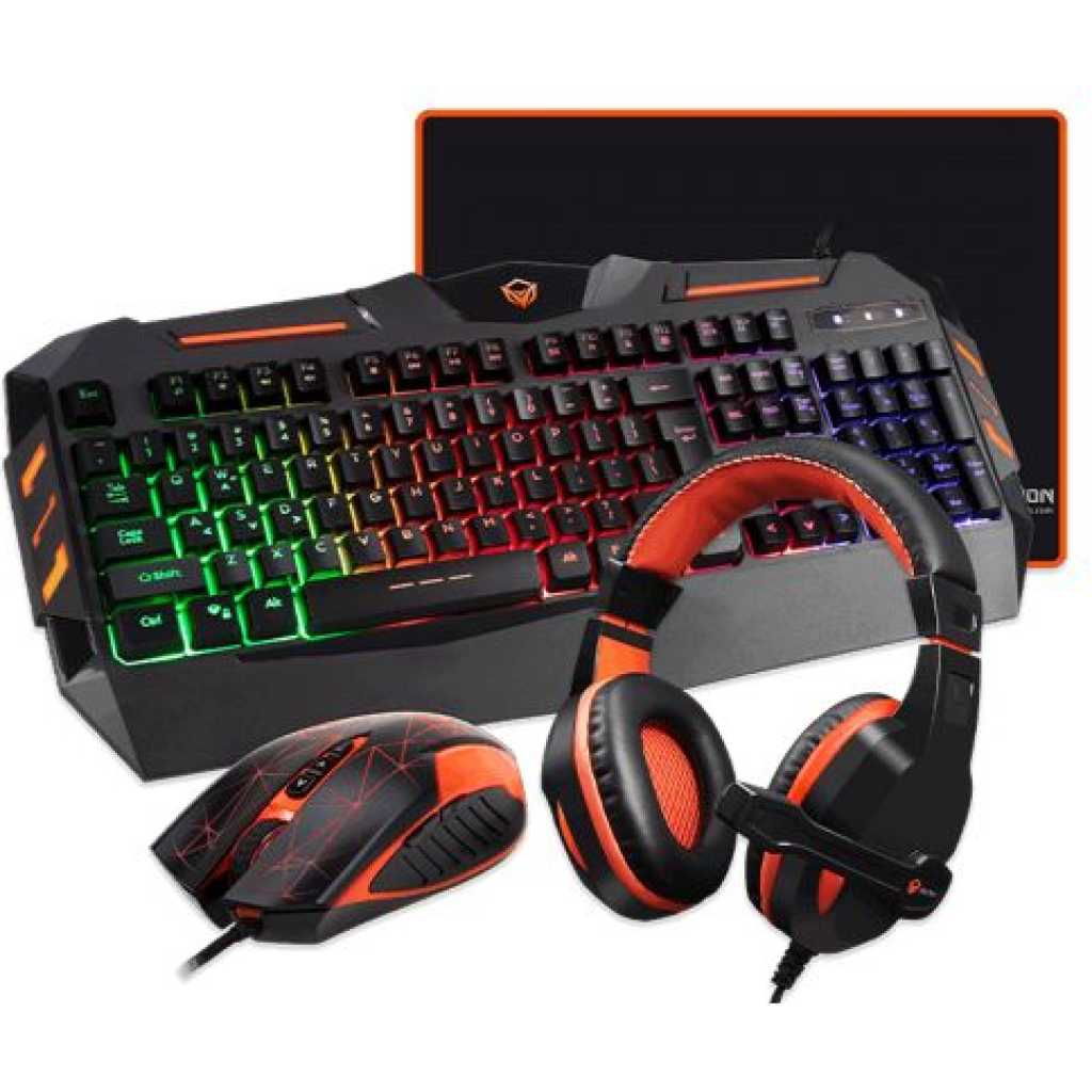 Key Features: Meetion 4 in 1 Gaming Keyboard Mouse and Headset Bundle with Mouse Pad. Keyboard: Colorful backlit with breatheComfortable and soft keys, Suitable for gamersError-free running time, strokes: more than 10 000 00019 keys anti-ghosting, Gold plating USB Interface12 Fn shortcut buttons for Multimedia, Internet etc. Mouse: Ergonomic symmetric design for Right/Left handSoft touch, Two additional navigation buttons (Forward and Back)DPI switch, resolution: 800-3200Error-free running time, strokes: more than 3,000,000 Headphone: Comfortable leather ear coversHigh fidelity sound quality stereo unitHigh sensitivity microphone: Mouse Pad Cloth surface for high performanceNon-Skid natural rubber backOptical-friendly mouse pad for improved tracking