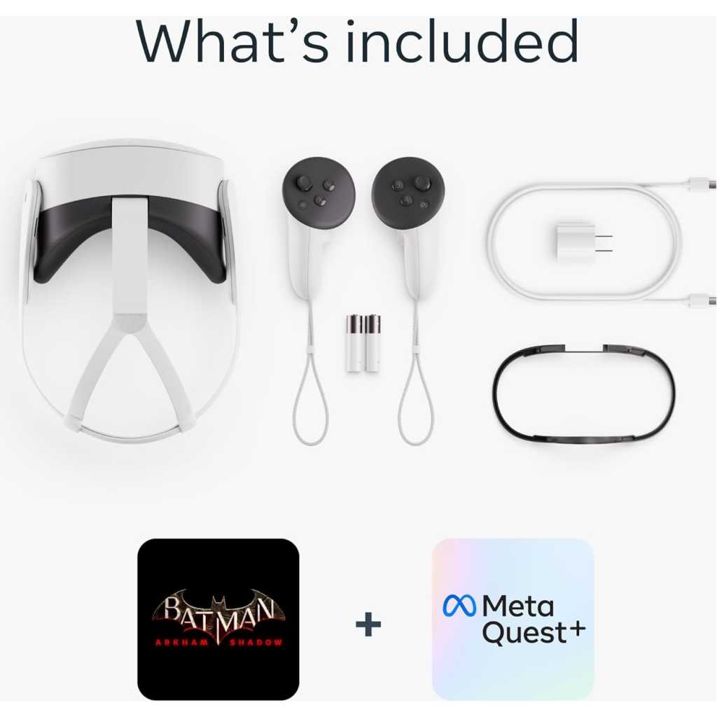 Key Features: Transform your reality and do everything you love in totally new ways. Welcome to Meta Quest 3S. Now you can get the Batman: Arkham Shadow* and a 3-month trial of Meta Quest+** (a combined $70 value) with purchase. Batman: Arkham Shadow available to play 10/22. Explore thousands of unreal experiences with mixed reality, where you can blend digital objects into the room around you or dial up the immersion in VR. Have more fun with friends in Quest. Whether you’re stepping into an immersive game with people from around the world, watching a live concert together in Meta Horizon or inviting everyone over to cast your play onto the TV. Multi-tasking has never been this easy. Pull up multiple screens at once to browse the web, watch YouTube and direct message with friends — all while keeping your room in view. Turn any room into your own personal theater. Dim the space around you and watch on a giant, vibrant screen. Go all in with USB-C headphones, or plug in any 3.5mm headphones with a USB-C adapter (sold separately). Access social media apps like WhatsApp, Instagram and Facebook Messenger so you can play while you stay in the group chat. Move with ultimate wireless freedom and lightweight comfort when you get your heart pumping in virtual workouts or use your whole body to bust ghosts in your living room. Enjoy powerful performance that brings virtual objects to life with 2X the graphical processing (GPU) compared to Meta Quest 2*. Use your hands to swipe through content or your Touch Plus Controllers for realistic sensations and fine-tuned precision. *Based on the graphic performance of the Qualcomm Snapdragon XR2 Gen 2 platform vs the Meta Quest 2 platform. Feel safe to share the fun. Manage parental controls, check your child’s daily usage, add multiple users, share content and set permissions for everyone in the family. See child safety guidance online; Accounts for 10+.