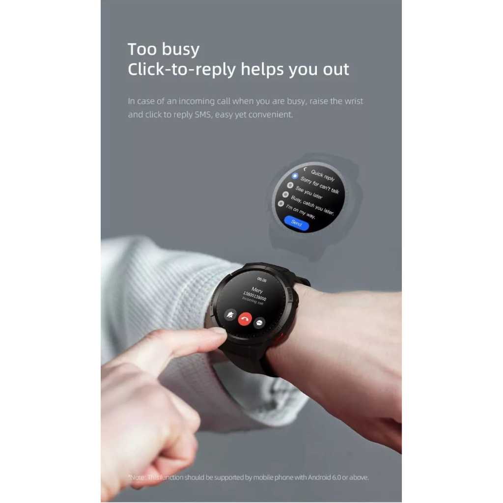 I Mibro Watch GS: GPS Sports Watch Primed For You Dual-Core Main Chip For More Superior Performance Smooth experience powered by innovative dual-core Bluetooth main control chip, low power consumption dual-core architecture and built-in 2.5D GPU graphic processing unit. CPU frequency: Max. 240MHz Refreshing frame rate: Max. 60Hz Super AMOLED screen vividly presents the colorful world 1.43-inch HD AMOLED screen and chip-level drive capability (built-in PS RAM) bring you each tiny detail for broader and clearer vision. AOD screen-off display Always on display makes you feel more secure Mibro Watch GS supports AOD (Always on Display) screen-off clock display and multiple forms of screen-off watch faces. Note: Battery life will be shortened if AOD mode is activated. Precise GPS satellite positioning makes your outdoor journey more enjoyable GPS, Beidou, GLONASS, GZSS satellite positioning and rapid search positioning trace and record detailed motion trajectory. 70 sports modes Record all challenging moments and help you explore new modes Raise your wrist to read your real-time fitness metrics. It helps you to be your best. Useful sports data analysis and suggestions based on professional sports algorithms and data analysis. Real-time monitoring of your health status It presents real-time body data and health analysis results. It helps you immediately know your health status to protect your health around the clock. 24H heart rate monitoring: New heart rate sensor is embedded for more precise heart rate monitoring. Monitor your heart health in advance. SpO2 measurement: Know your health better with SpO2 Measurement. Make immediate adjustment in case of hypoxemia. Sleep monitoring: Your health is undermined by staying up late and poor sleep quality. Wearing the watch at night helps to monitor your sleep quality for better health. Stress testing: All-day-round stress monitoring helps to adjust your breath and relief your pressure, making you vitalized for doubled efficiency. Note: The measurements are not intended for medical use, including self-diagnosis or consultation with a doctor, and are designed only for general fitness and wellness purposes. Too busy? Click-to-reply helps you out. In case of an incoming call when you are busy, raise the wrist and click to reply SMS, easy yet convenient. Note: This function should be supported by mobile phone with Android 6.0 or above; Diverse distinct watch face options You can customize your own watch face. Uploading photos in your mobile phone to customize your own watch face. You can click to switch the screen photo, easy yet convenient. 460mAh high-density battery 24-day ultra-long battery life Low power consumption dual-core architecture and intelligent power source management system empower 24-day ultra-long battery life, making you worry free. Daily mode: 24 days Basic mode: 100 days GPS mode: 15 hours