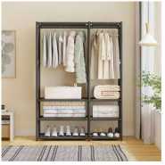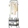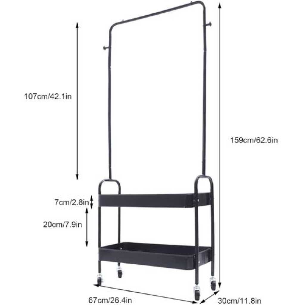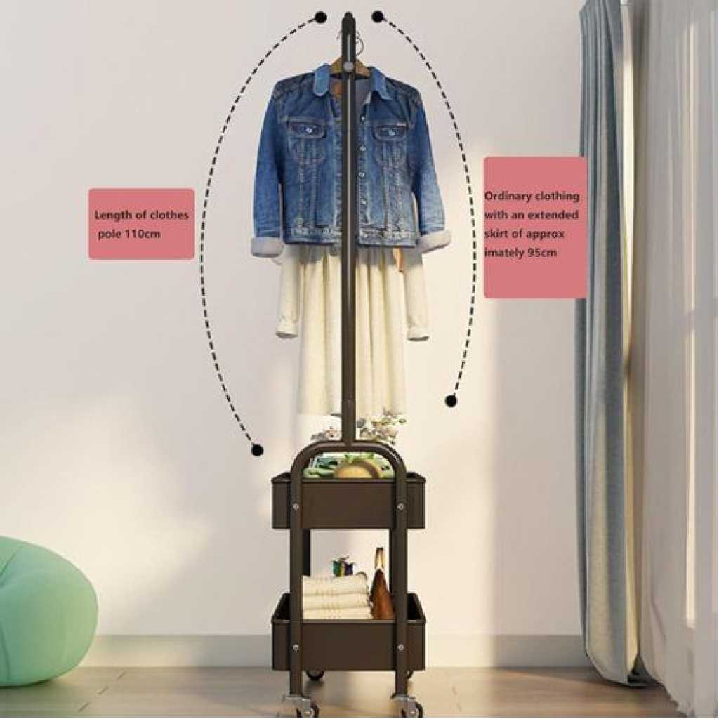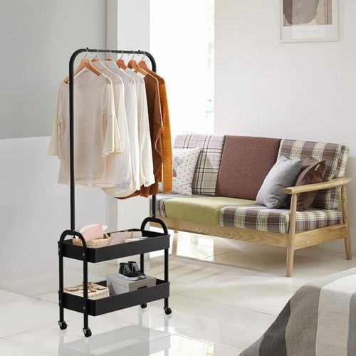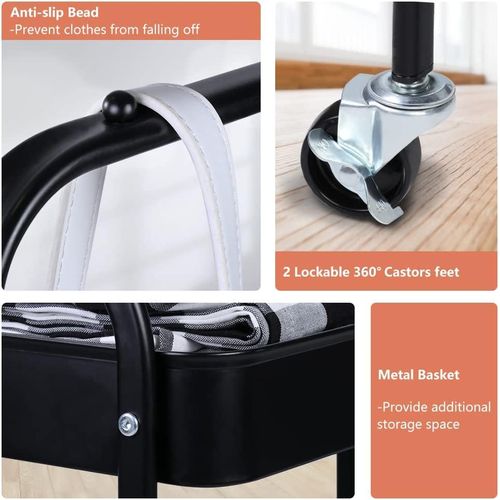 【MULTIFUNCTIONAL RACK】 Our 2-in-1 rolling garment cart not only can be used as a coat rack, but also as a laundry rack or a plant cart. It is great for small spaces such as college dorms, closet-less rooms as well as laundry rooms to hang or dry clothing. 【STURDY AND LARGE CAPACITY】This portable clothes organizer is made of a highly resistant metal and coated with powder to enhance protection against rust and corrosion. 2 Tier metal baskets create extra storage for shoes, bags, boxes and folded clothes. 【INTIMATE DETAIL DESIGN】Top hanging rail designed with stoppers on each side to prevent the clothes from falling. Laundry cart come with 4 Wheels and 2 of which are equipped with brakes for stable parking even on slopes. 【EASY TO ASSEMBLE AND CLEAN】According to the assembly instruction and the parts provided, the Free standing clothing rack can be assembled quickly. And you can clean the surface of the coat rack simply by wiping with a cloth. 【AFTER SERVICE】56.6 CM L x 31.5 CM W x 152.4 CM H. This clothing storage stand is suitable for bedroom, kids room, living room,dormitory and laundry room etc. Feel free to ask any questions to ensure the small garment rack comes exactly as you expect it