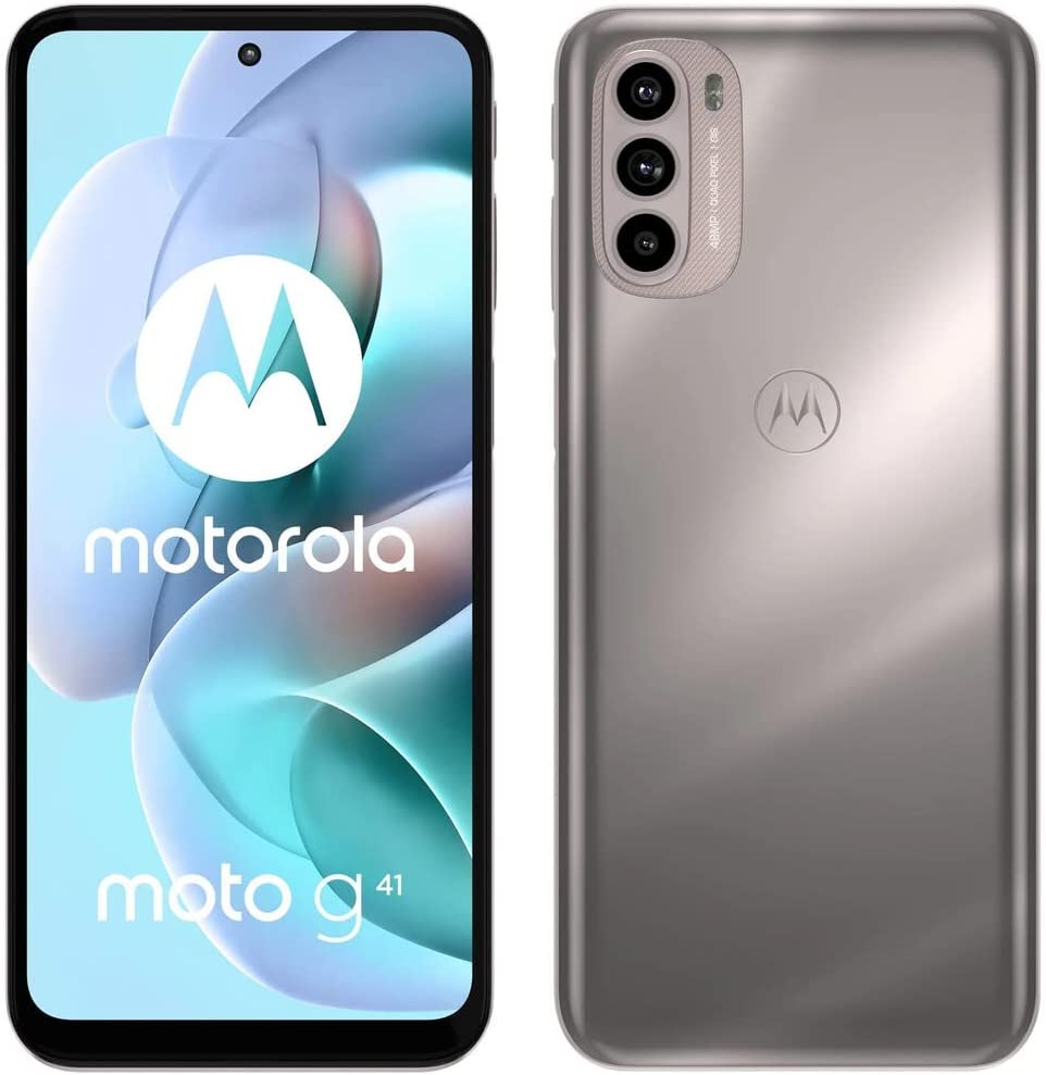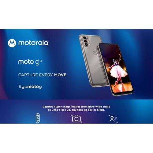 Key Features: Motorola Moto G41 6.4″ 6GB RAM 128GB ROM 48MP – Zinc Silk. NETWORK: Technology: GSM / HSPA / LTE SIM: Dual SIM (Nano-SIM, dual stand-by) Size: 6.4 inches OS: Android 11 Internal: 128GB 6GB RAM MAIN CAMERA: Dual 48 MP WLAN: Wi-Fi 802.11 a/b/g/n/ac, dual-band, Wi-Fi Direct, BATTERY: Non-removable Li-Ion 5000 mAh battery