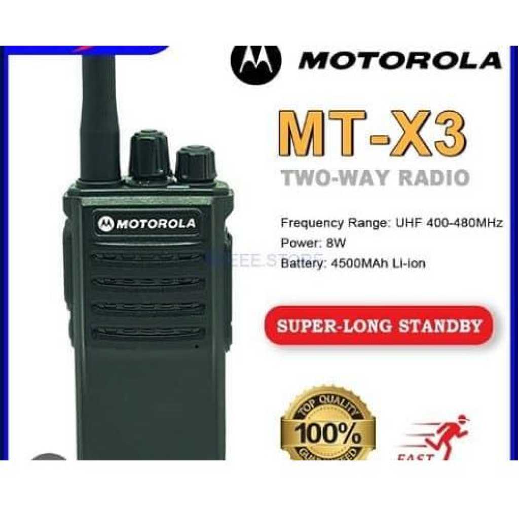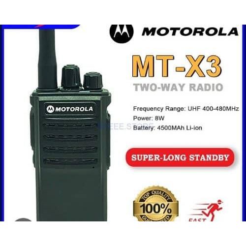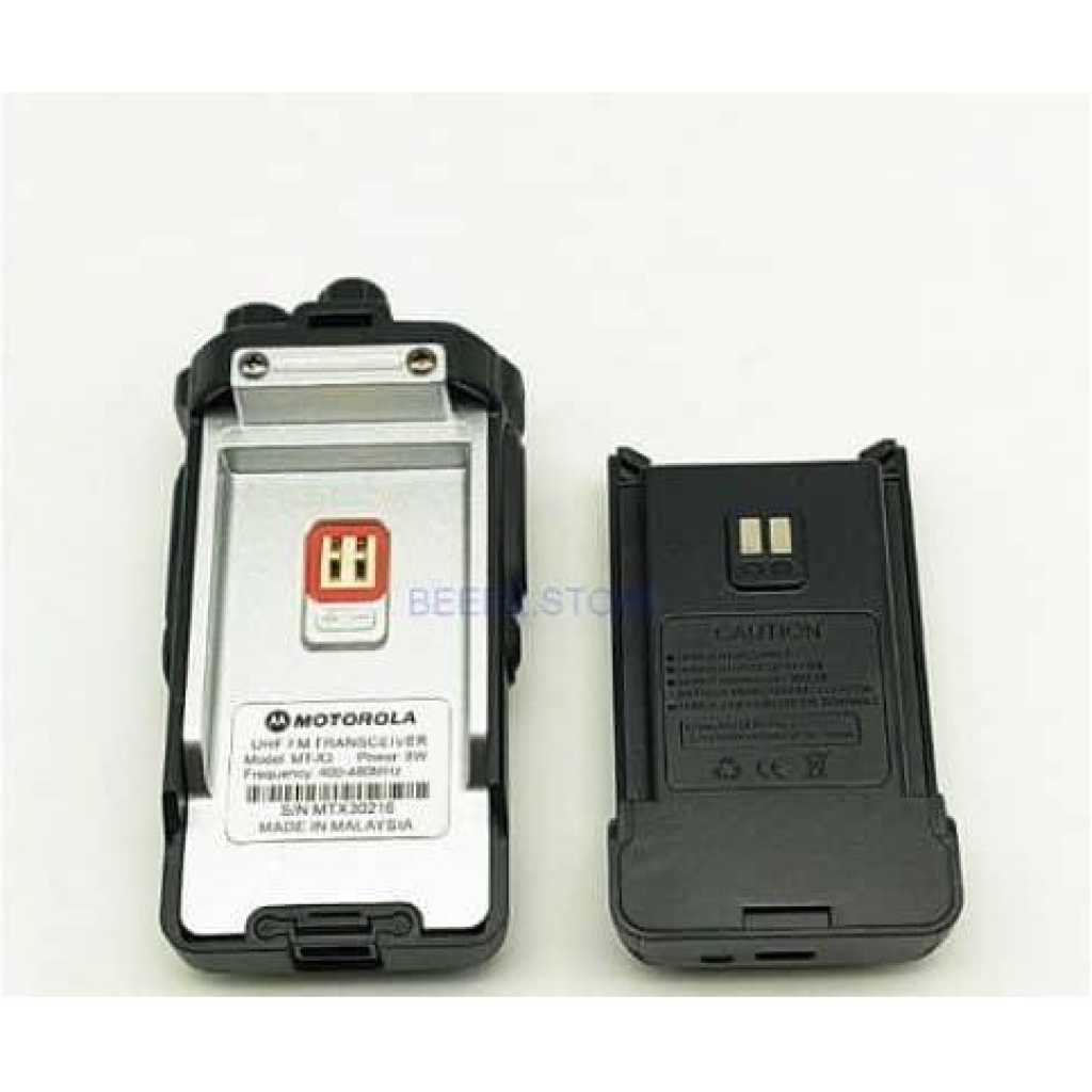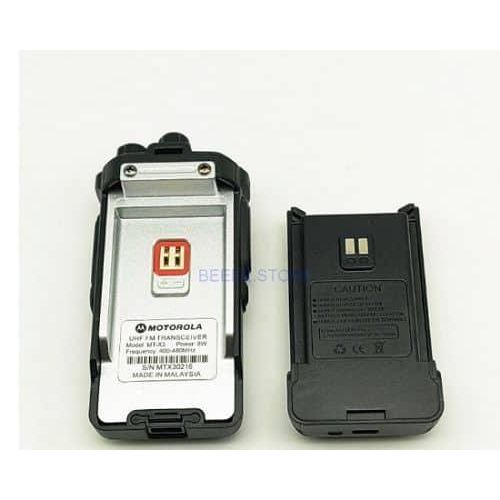 NTEGRAL PART OF THE frequency range: 400-480MHz temperature range: -20 degrees Celsius to +50 degrees Celsius Rated voltage: 7.2V working: Same frequency simplex or different frequency simple size: 126x57x38mm (excluding antenna) weight: of about 182g (including battery pack) Antenna impedance: 50Ω INTEGRAL PART carrier frequency tolerance: ± 2.5ppm Carrier output power: 8W Modulation limit: ≤5KHz Audio Distortion: ≤5% modulation characteristics: +3 dB-3dB Adjacent Channel Power: ≥ 65dB spurious frequency components: ≤7.5pW Occupied Bandwidth: ≤16KHz RECEIVING PART Reference sensitivity: ≤0.2pV Audio Distortion: ≤5% Audio Response: +2 dB~-10dB co-channel rejection: ≥-8dB Adjacent Channel Selectivity: ≥ 55dB Intermodulation Immunity: ≥55dB spurious response immunity: ≥55dB Blocking characteristics: ≥ 85dB Contains: 1 x MT-X3 Walkie Talkie 1 x Antenna 1 x Li-ion Battery 1 x Charger + Cable 1 x Clip 1 x User Manual