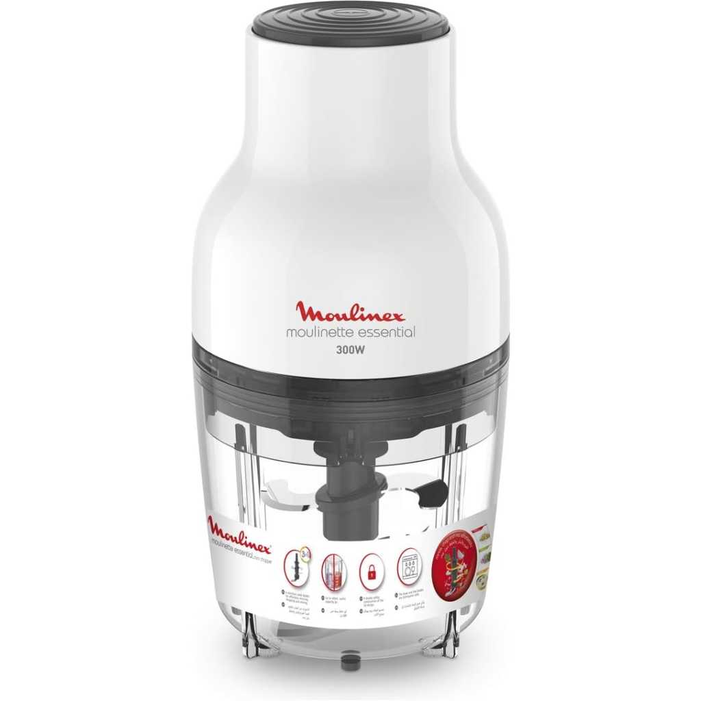 Key Features: Moulinex Moulinette Essential Chopper, 300 watts, Plastic, DJ520127 – White /Black. POWERFUL PERFORMANCE: 300W LONG-LASTING BLADES: 4 sharp stainless steel blades 3-IN-1 ACTION: Once convenient device that minces, chops and mixes VERSATILE CAPACITY: 0.4 L capacity SECURE DESIGN: Non-slip feet SAFE CLOSURE: Double-security design of the lid CONVENIENT CLEANING: Dishwasher-safe