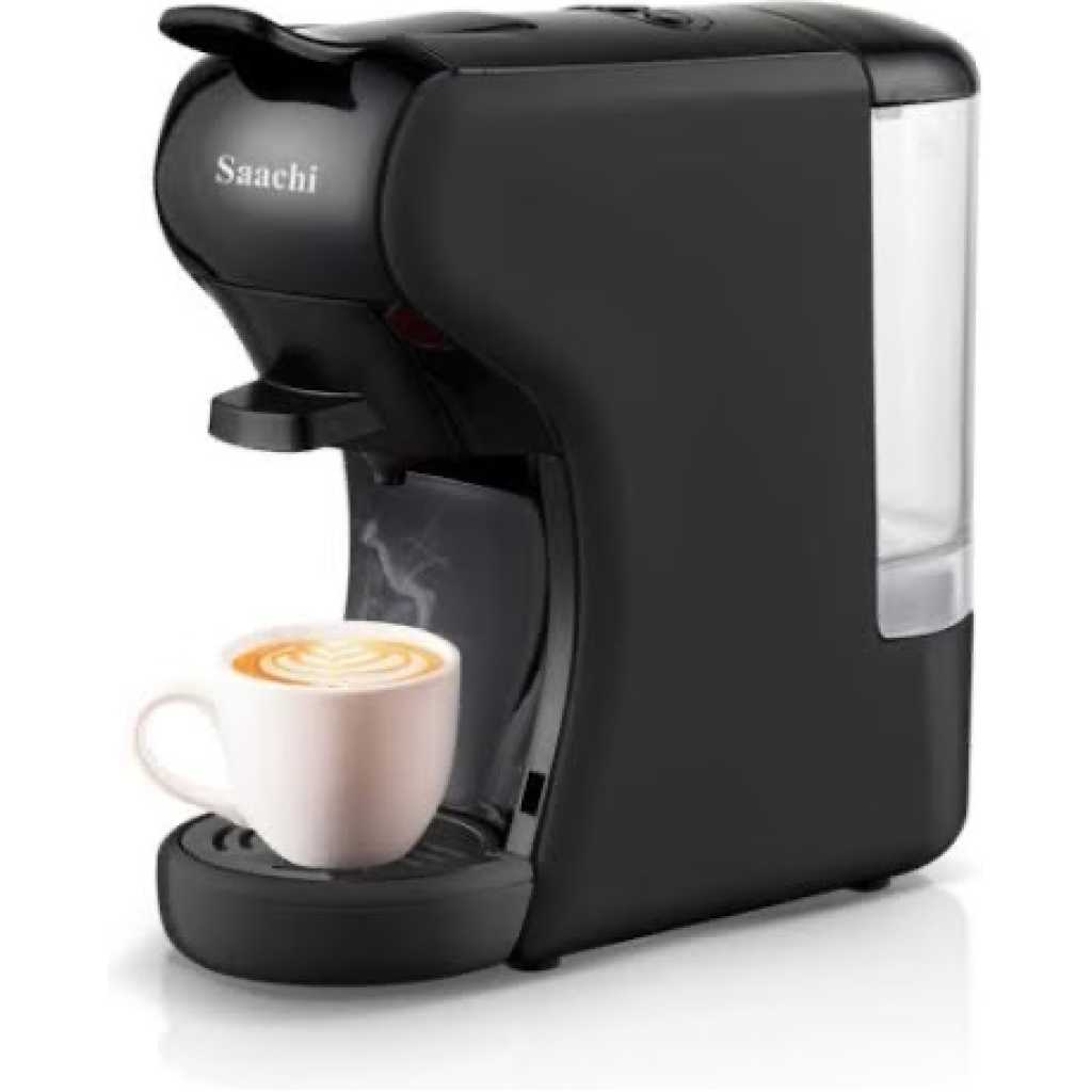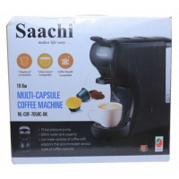Saachi 19Bar Multi-Capsule Coffee Machine; Nespresso, Gusto and Coffee Powder compatible -Black The next generation of coffee makers is finally here. The Saachi Capsule Coffee Maker can make all your favourite types of coffee with ease. The appliance can be used with store-bought coffee capsules containing a variety of flavors or can also be used with regular coffee powder. This appliance is compatible with both Nespresso and Dulce Gusto capsules making it one of the most convenient coffee makers in the market today. The product is available in 4 different colours providing you with the ideal balance of style and functionality. It has a 19 bar automatic steam pressure pump and a 600ml water tank. It also has two dispensing methods (short or long) making it adaptable to your preferences. Can make varieties of coffee with adoptors that accomodate various types of coffee capsules. Compatible with Nespresso, Gusto and Coffee powder. Two dispensing buttons, short or long, and can be programmed or manually operated for dispensing and interruption. 19 Bar Pump guarantees an optimum extraction for various kinds of coffee The drip tray can be adjusted on two levels and collects excess liquid. The Light Indicator warns that the Coffee machine is ready for use after approximately 45 seconds from starting. Powe saver function allows an automatic shut down after 15 minutes of being inactive Removable transparent tank with 600ml capacity Power. 1450W Color. Black Model No. NL-COF-7058C-BKMain Material. Plastic