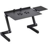 Key Features: This table can also accomodate big size laptops. Has Big cooling fan which is most effective. Also includes mouse pad. Black colour Light weight aluminum tray Fully adjustable Legs Rotate 360 Degrees and Lock in Place at Various Angles. Quickly Collapses The Stand to Make it Portable Multiple uses, For a TV Dinner Tray, Sound Equipment, Projector, Standing Desk, Book Tray, Writing Desk, and Tablet Hold Silent USB powered CPU Cooling funs Connect USB Cord (Included) to Your Computer to Power The Quiet Cooling