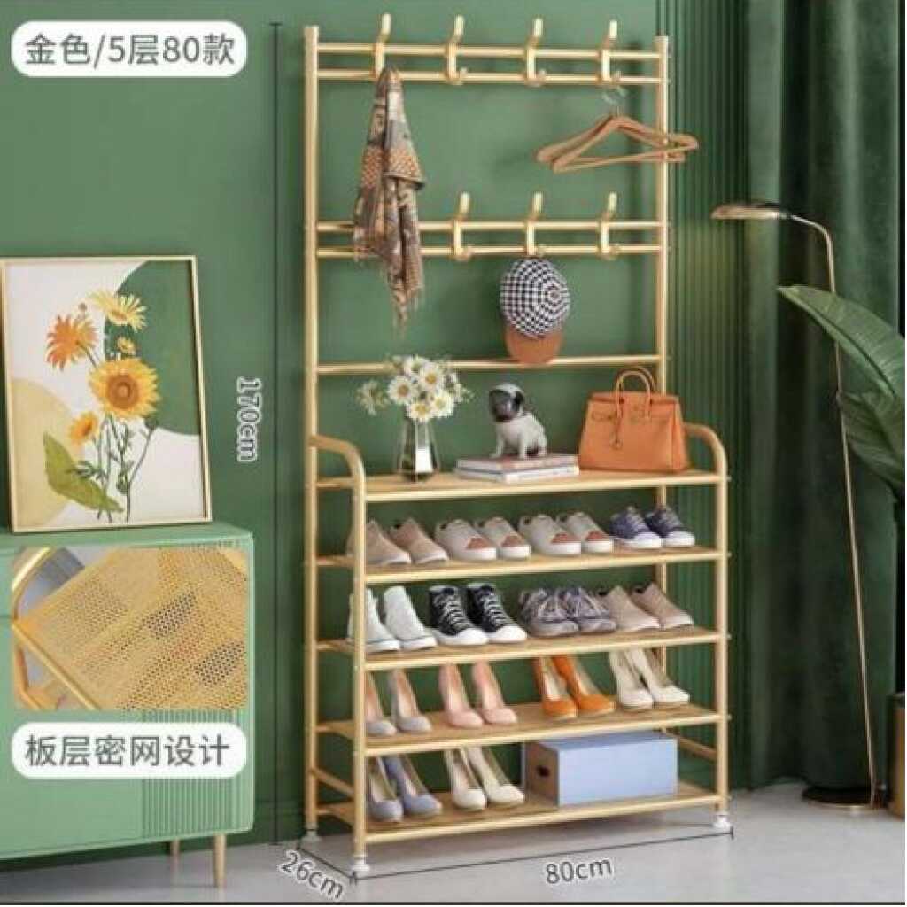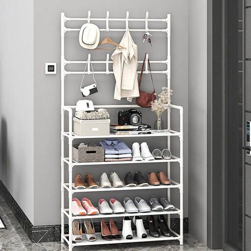 Multi-functional Coat Rack Stand with 5 Tier Shoe Rack Storage Clothes Rack with 8 Hooks Organizer. Standing tall in fashion and with functioning simplicity design and style, this elegant coat stand will let your hallway, entryway or balcony more organised. It is really part of an essential unit of your daily life. This unit offers you a clutter free home and a comfortable life. With the precisely design, the screws locate in the hole well and the holes are line up with the shelves. The metal outer layer is painted by baking varnish, being rustproof. A perfect coat rack and shoe storage bench, allow you to hang your clothes, bags, umbrellas, and store your shoes, storage boxes handbags in a limited space. 【Multifunctional Rack】This is the perfect combination of shoe rack, coat rack and other small items storage. No need to mount on the wall, no damage to your wall. This shoe rack is freestanding and removable. It can be placed anywhere and moved as needed. narrow shoe cabinet Suitable for multiple spaces, whether it’s an entryway, hall, foyer, hallway, bedroom or bathroom, etc. 【Save space】 The coat rack part has 2 layers with 16 removable hooks for easy storage of clothes, hats, bags, scarves, umbrellas, keys, etc. to meet various hanging needs shoe storage. 5shoe rack layers of non-woven dustproof shoe racks are designed to provide more storage space for storing shoes. 【High quality material】 The overall size of the hanger is LxWxH-23.5 inches x 11 inches x 67.5 inches. The frame is made of high quality 16mm thick plastic sprayed steel pipe, plastic joints and thick waterproof non-woven fabric. Dustproof, rustproof, more wear-resistant and strong load-bearing capacity. 【Easy Assembly】 provides easy to understand assembly instructions. With the help of the instructions, it can be easily assembled and disassembled without any special tools