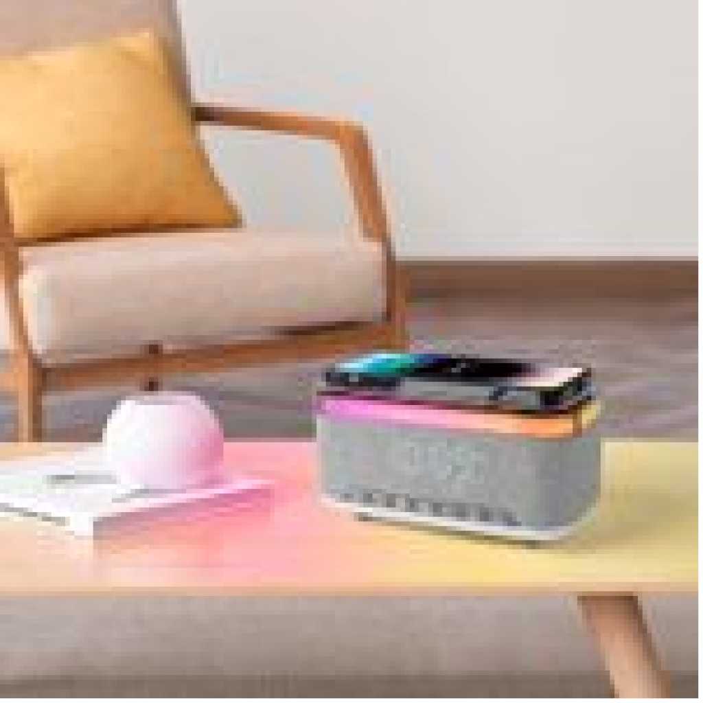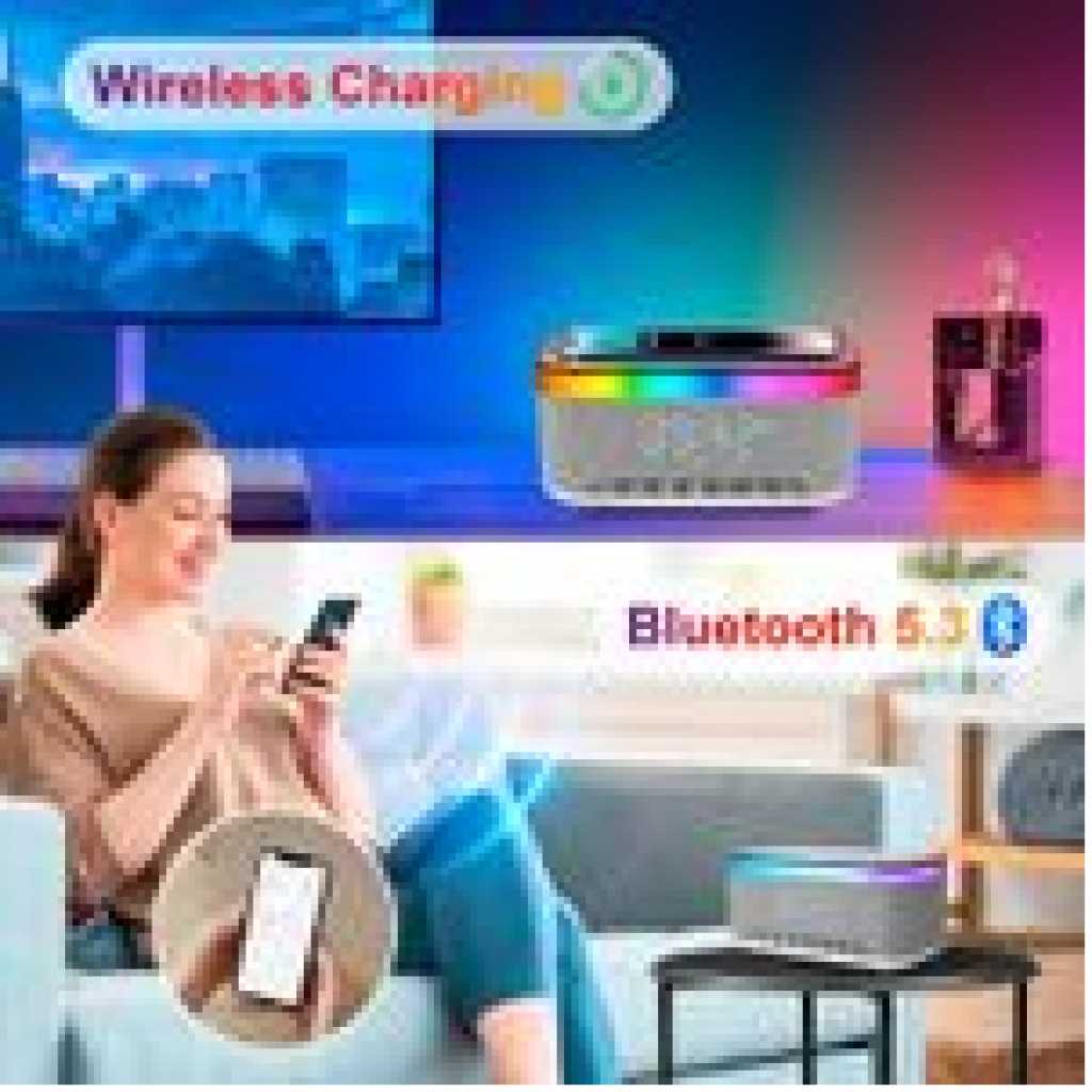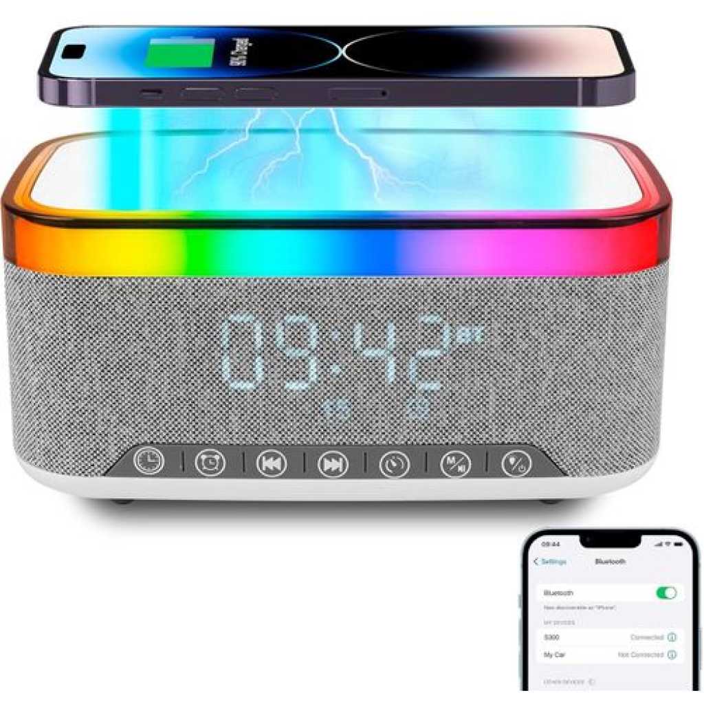 – 15W Wireless Charging Charging Sleep Lamp Sunrise Wake Up Lamp Atmosphere Bedside Lamp Touching Lamp Bluetooth Audio Clock Alarm Effect. – You can adjust the sound, volume, light color and brightness and customize a healthy sleep routine and night light. The snooze alarm clock is soft and peaceful to make your body wake up more slowly. – Atmosphere light charging with 13 different dynamic lighting effects, helping you create any mood you want. – It is an ideal gift for aesthetic room decoration, birthday, Christmas, Mother’s Day, Father’s Day, New Year, Thanksgiving Day and so on. Specification Material: ABS + PC. Grey colour Weight: 850 g Wireless power: 15W Output power: 5W Bluetooth Name: S-300 Bluetooth frequency: 2.4 GHz-2.48 GHz Transmission distance: 10 m Frequency sound range: 50 Hz-20 kHz Package includes: 1 x atmosphere lamp. 1 x USB. 1 x instructions.