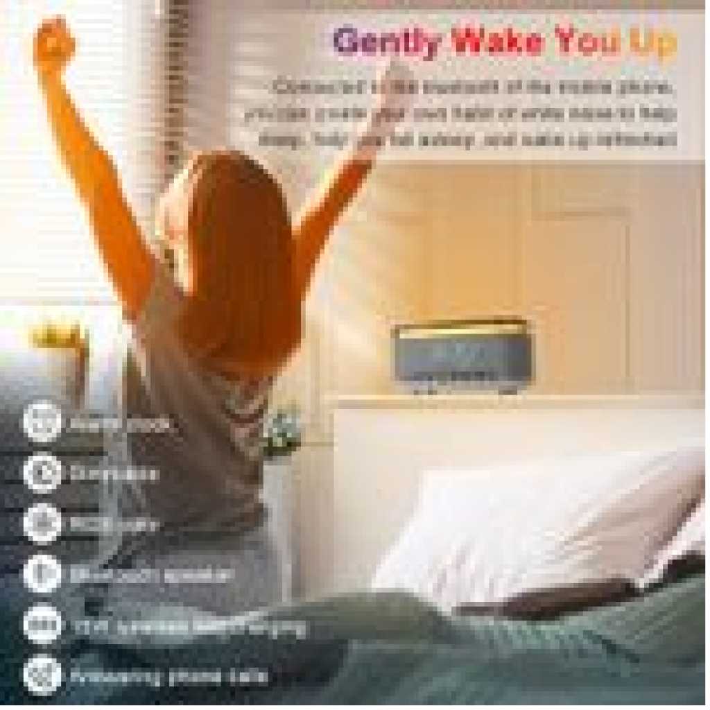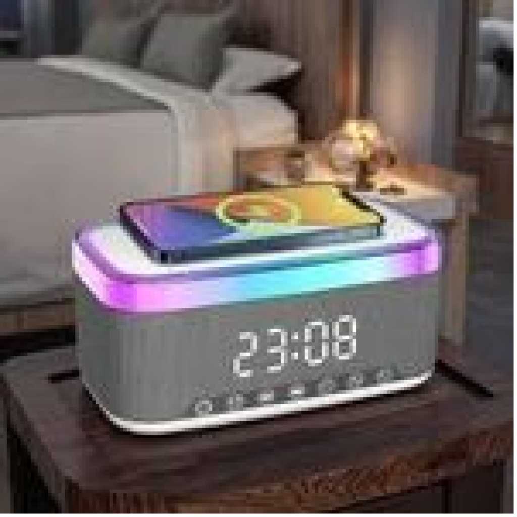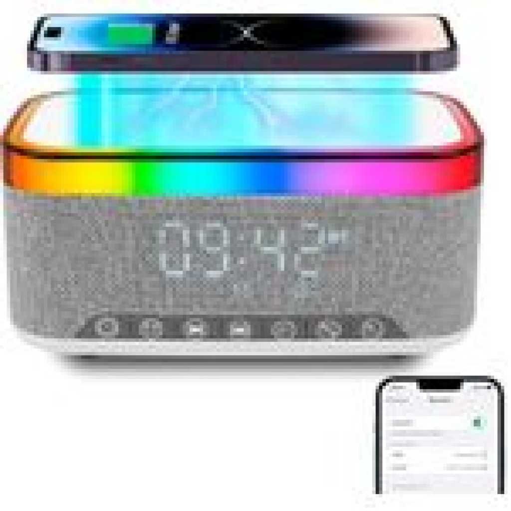 – 15W Wireless Charging Charging Sleep Lamp Sunrise Wake Up Lamp Atmosphere Bedside Lamp Touching Lamp Bluetooth Audio Clock Alarm Effect. – You can adjust the sound, volume, light color and brightness and customize a healthy sleep routine and night light. The snooze alarm clock is soft and peaceful to make your body wake up more slowly. – Atmosphere light charging with 13 different dynamic lighting effects, helping you create any mood you want. – It is an ideal gift for aesthetic room decoration, birthday, Christmas, Mother’s Day, Father’s Day, New Year, Thanksgiving Day and so on. Specification Material: ABS + PC. Grey colour Weight: 850 g Wireless power: 15W Output power: 5W Bluetooth Name: S-300 Bluetooth frequency: 2.4 GHz-2.48 GHz Transmission distance: 10 m Frequency sound range: 50 Hz-20 kHz Package includes: 1 x atmosphere lamp. 1 x USB. 1 x instructions.